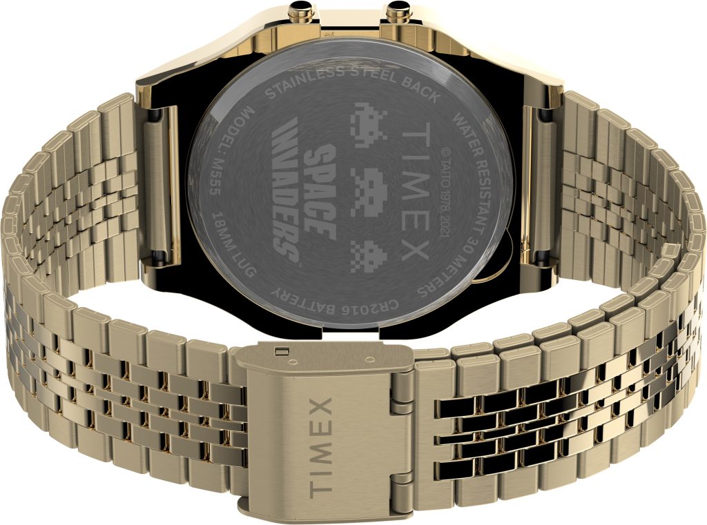 Ispirato all’iconico videogioco a tema “invasione aliena” lanciato nel 1978, il classico modello T80 viene vestito per l’occasione da piccole navicelle rosse distribuite sulla parte superiore dello schermo. Al centro il logo Timex della stessa tonalità, e in basso il disegno del cannone. Ricordato dai gamer più tenaci, come lo strumento utilizzato per impedire agli alieni di sbarcare sulla luna.
