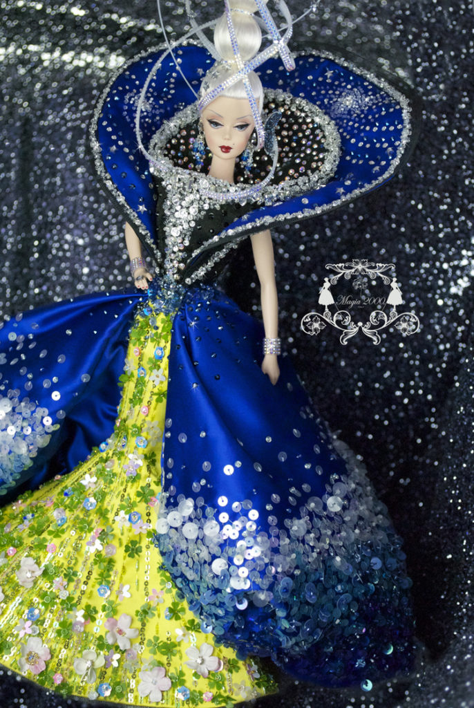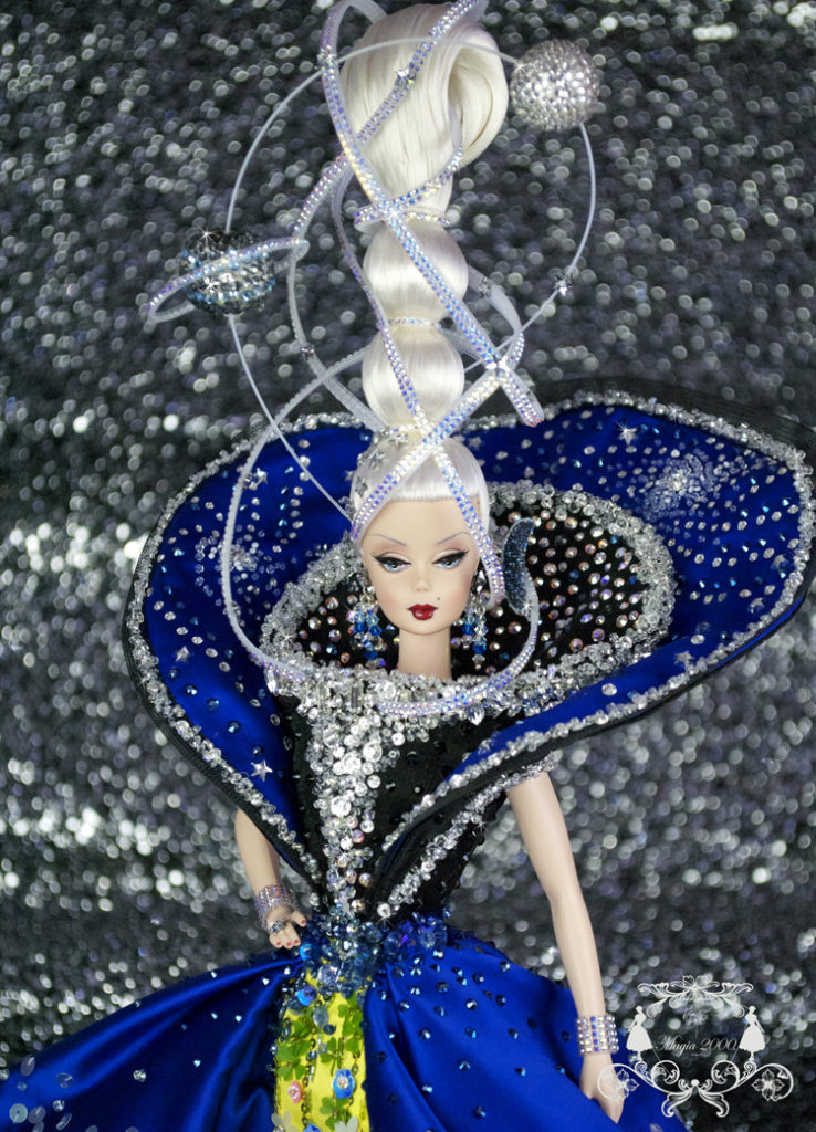 La Bambola ispirata a Samantha Cristoforetti la realizzammo per un’asta di beneficenza in America nel 2017. Io desideravo ricreare un viaggio dalla terra allo spazio. Ne uscì fuori questa bambola che andava letta dal basso verso l’altro: questa gonna molto ampia e ricamata sui toni del verde e del giallo che salendo diventa azzurra e poi blu sul corpetto. Fino ad arrivare al nero, al blu più scuro e a questa acconciatura altissima che richiama il sistema solare. È un viaggio che dalla terra passa per il cielo, fino ad arrivare allo spazio.