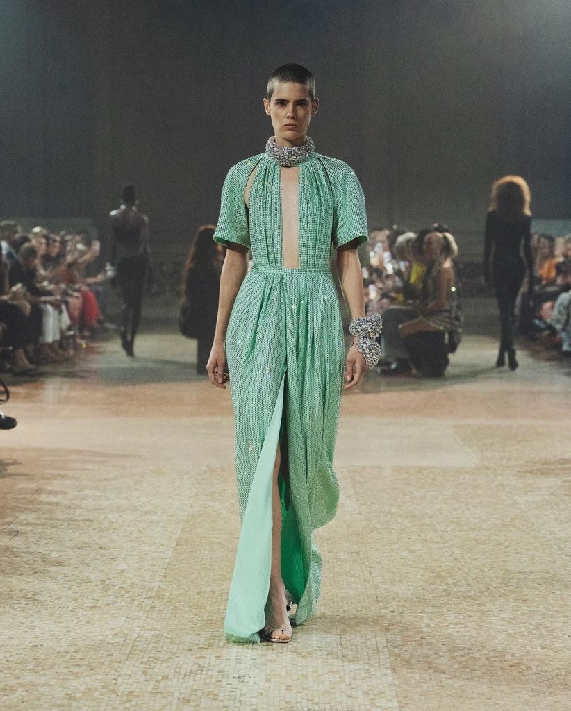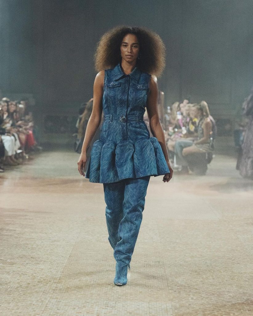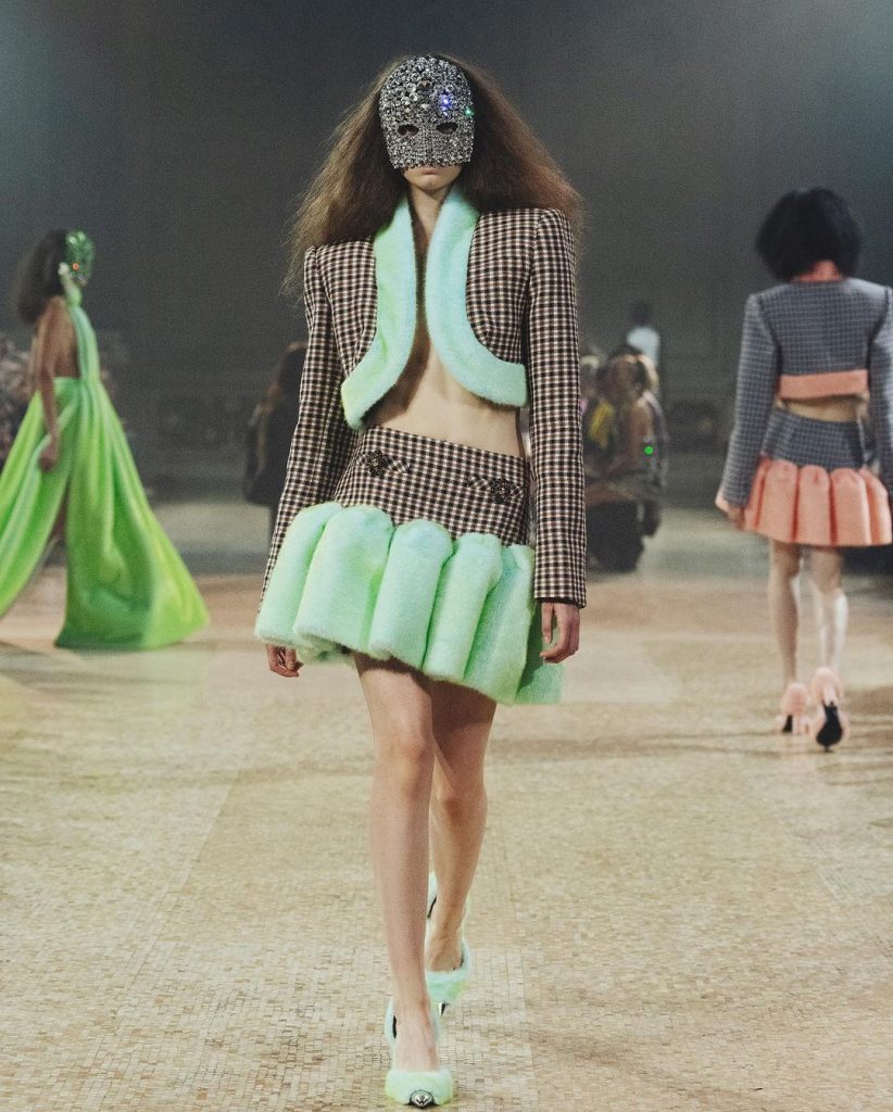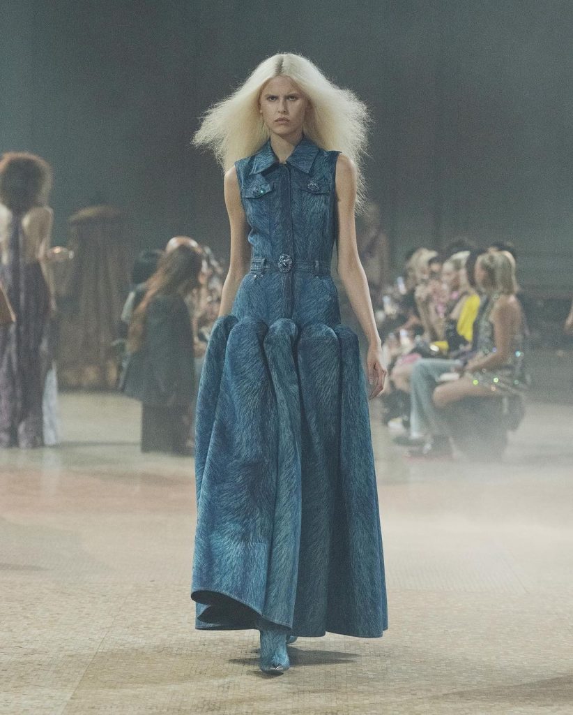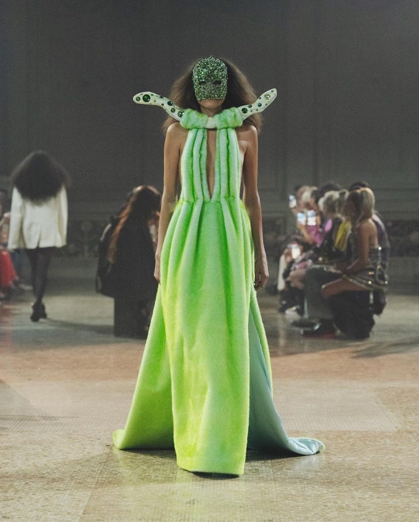 Nulla è lasciato al caso, ogni minimo dettaglio è giocato in modo da regalare la perfetta suggestione allo spettatore catapultato in una preistoria glamour e luccicante. Su forme rigorose e classiche esplode la forza del colore che regala alla collezione un immaginario incantato pur mantenendo una certa dimensione di cupa malinconia, quasi di terrore.