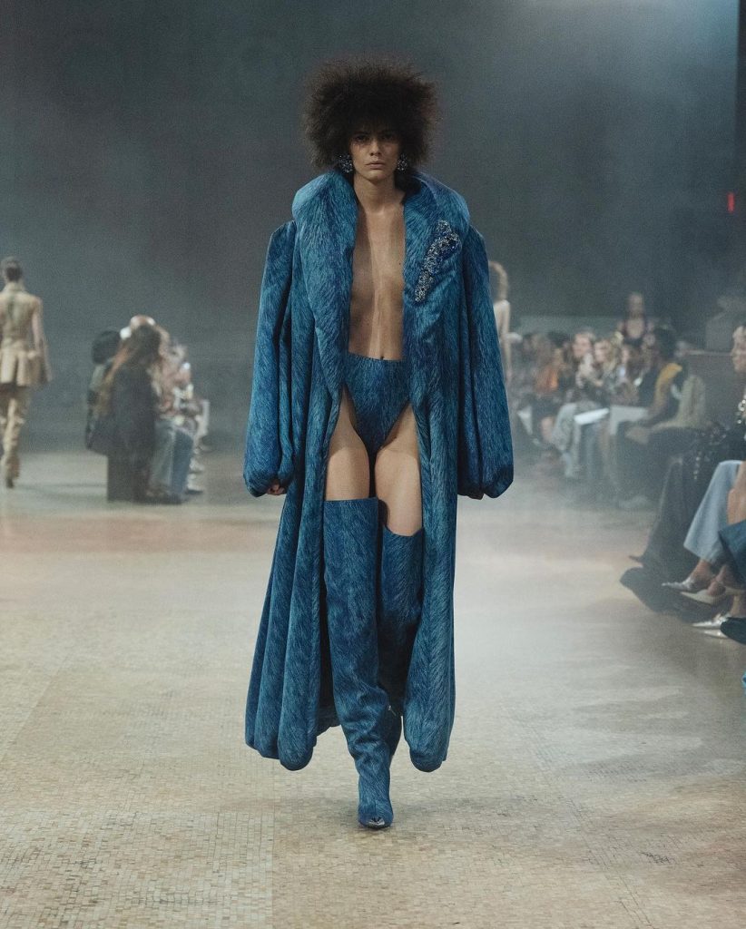 Calca la passerella a New York l’autunno inverno di Area che indaga i primordi dell’abbigliamento. Tornando indietro nel tempo, alla preistoria, in una collezione ironicamente titolata “Flinstone Couture”. Area si interroga sul senso stesso del vestire rendendo cool e glamour il mondo preistorico.