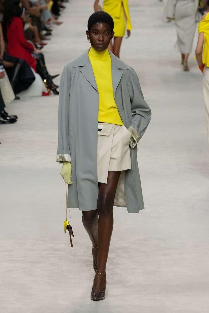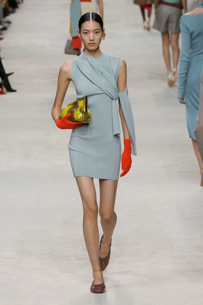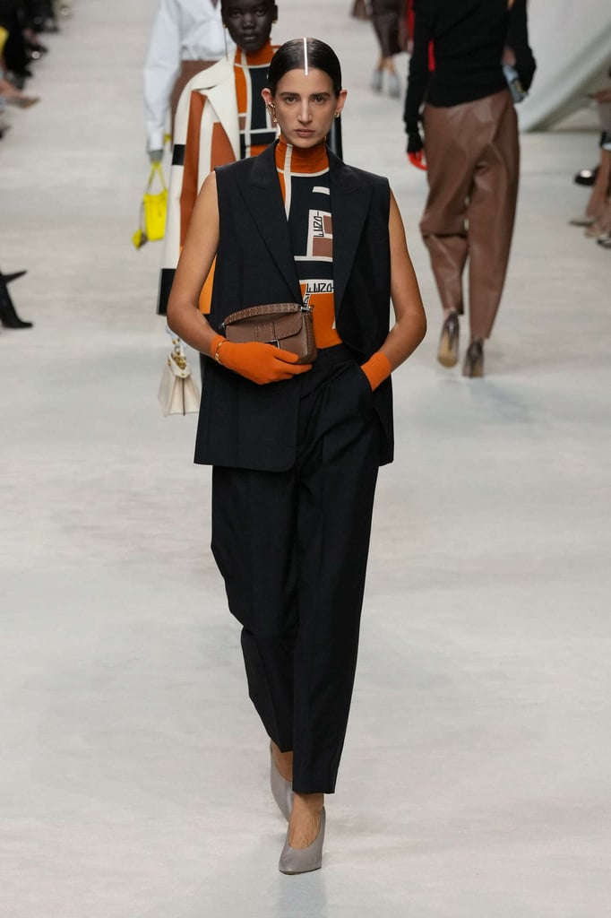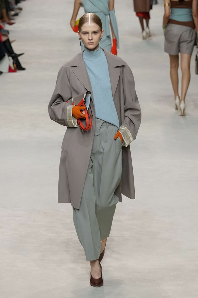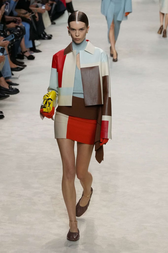 Seguono capispalla minimal dai disegni geometrici, giacche di pelle color-blocked, sulle tonalità del marrone, rosso, blu e crema, mentre per gli abiti le tonalità pastello si scontrano con arancioni e gialli vivaci. Per quanto riguarda le borse, FENDI opta per i classici : Peekaboo alle Baguettes, dalla Origami alla Firts, tutti capolavori di Silvia Venturini Fendi, che per quest’anno non percorre la passerella a fianco di Kim Jones.