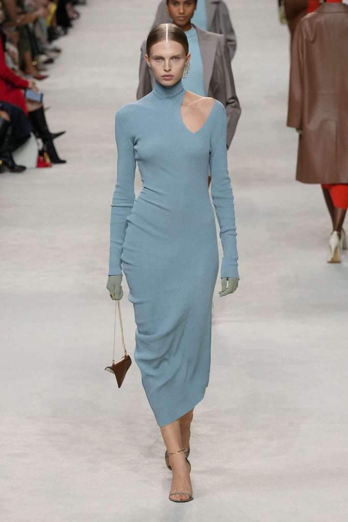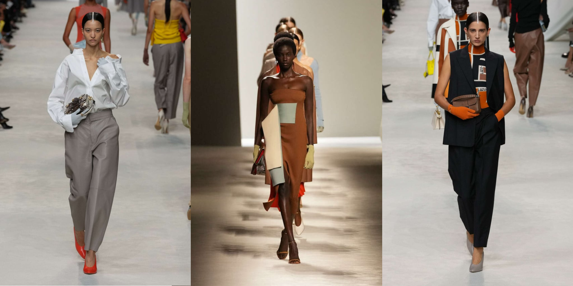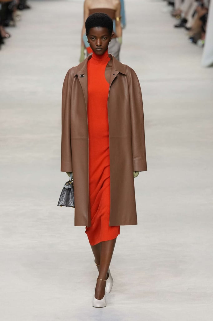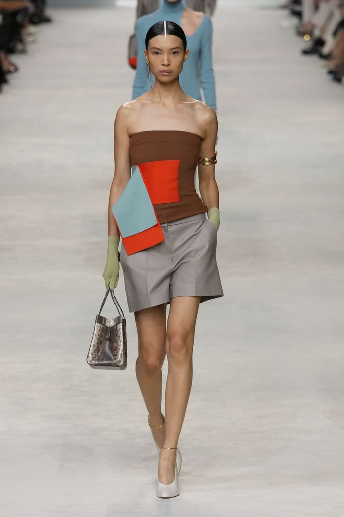Seguono capispalla minimal dai disegni geometrici, giacche di pelle color-blocked, sulle tonalità del marrone, rosso, blu e crema, mentre per gli abiti le tonalità pastello si scontrano con arancioni e gialli vivaci. Per quanto riguarda le borse, FENDI opta per i classici : Peekaboo alle Baguettes, dalla Origami alla Firts, tutti capolavori di Silvia Venturini Fendi, che per quest’anno non percorre la passerella a fianco di Kim Jones.