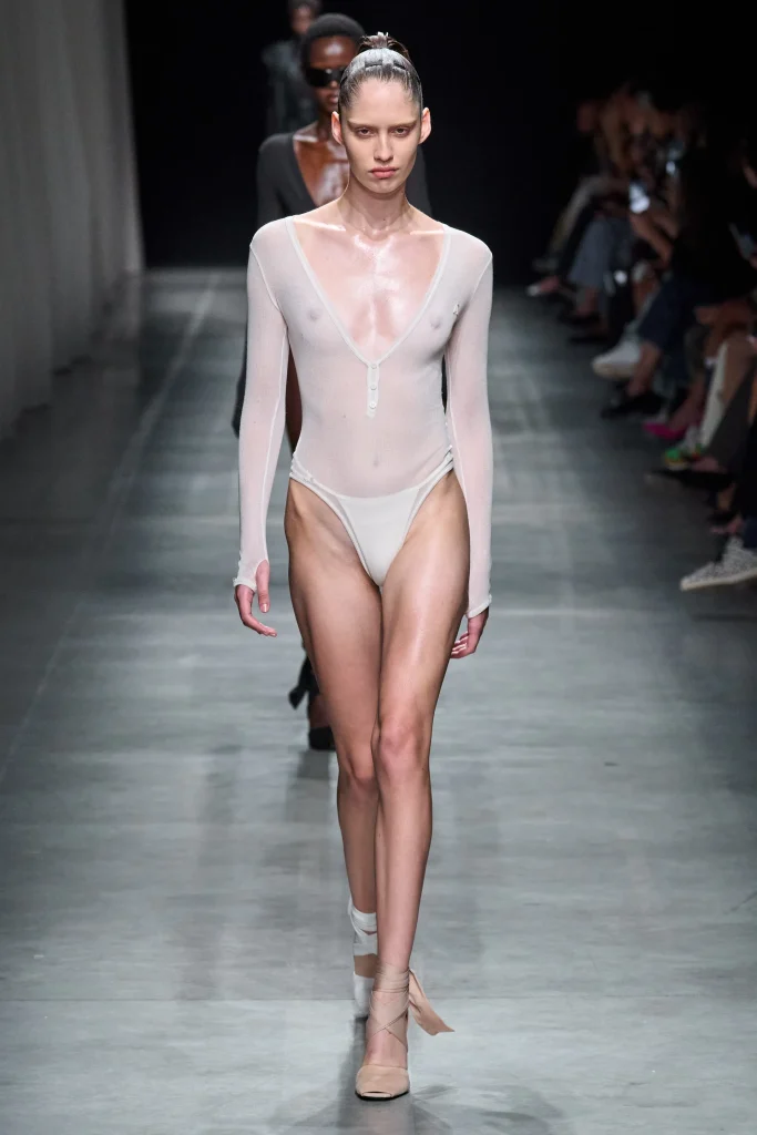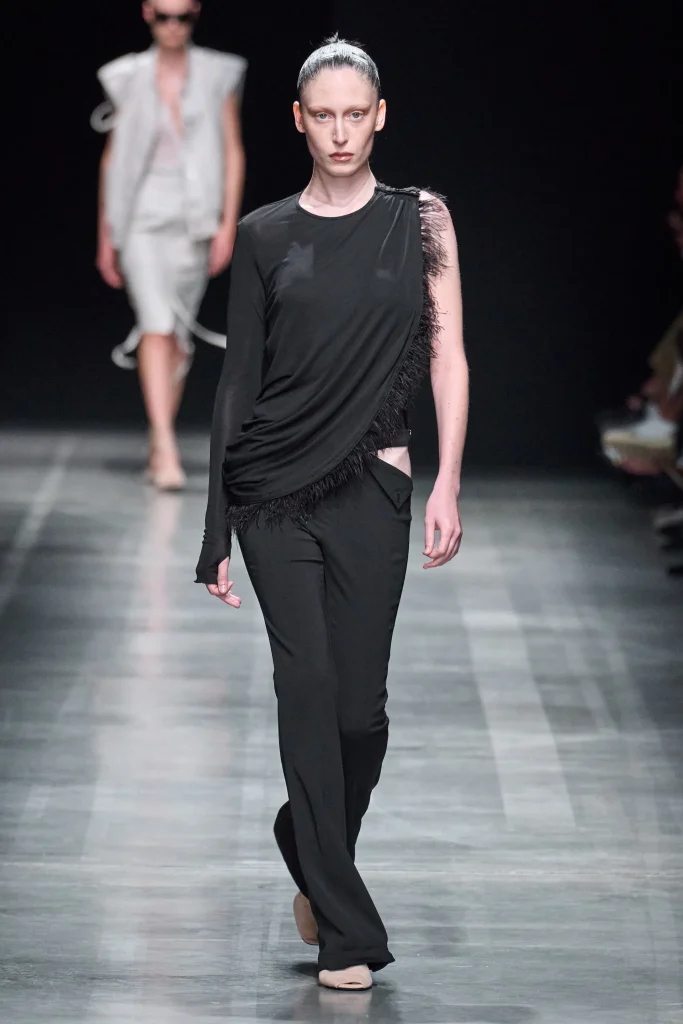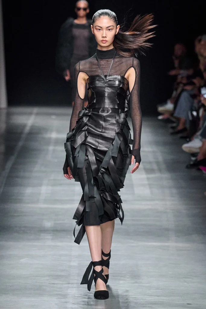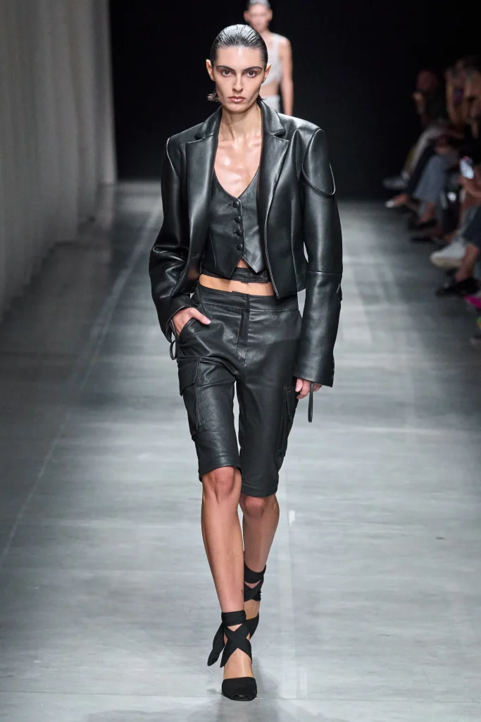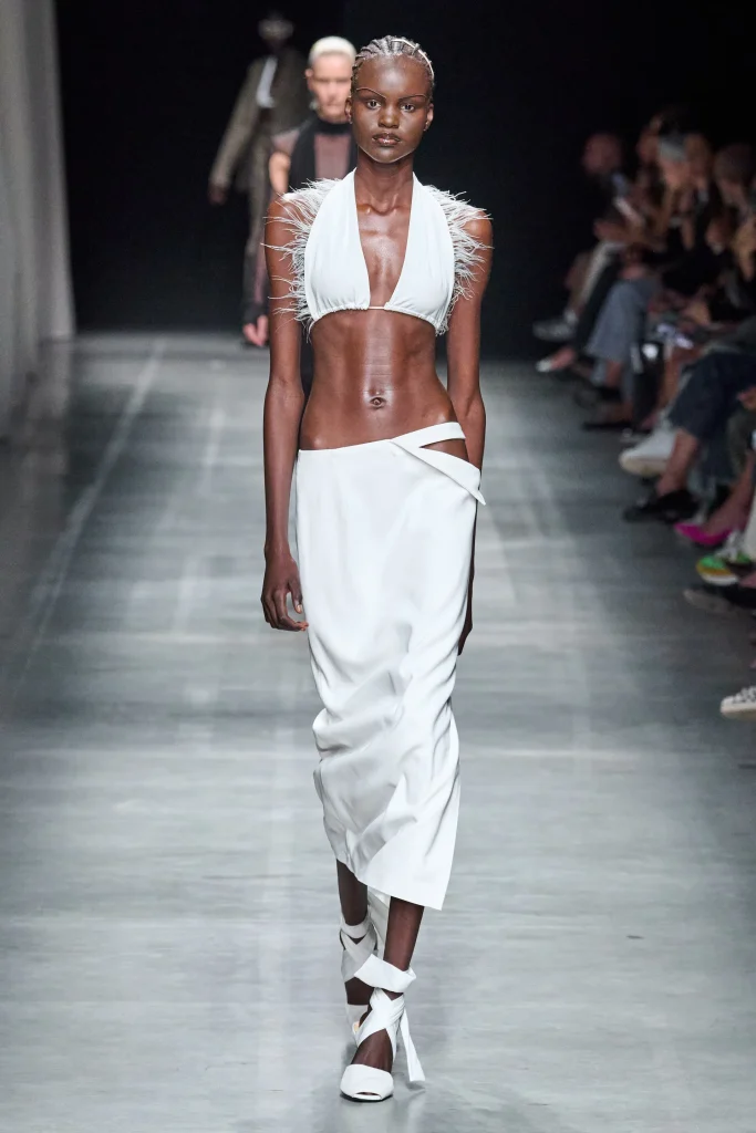 Vestirsi e non coprirsi ecco cosa tenta di fare Andrea Adamo con la sua SS24. Un trionfo di trasparenze, cut out e pelle che accompagnano il corpo delle donne avvolgendolo senza ingabbiarlo. Tutti i corpi vengono rappresentati sulla passerella del designer che li enfatizza con aderenze e giochi di proporzioni che ne mettono in luce la bellezza e, soprattutto, la sensualità. Una femminilità urlata con sofisticata eleganza quella di Andrea Adamo. Lo stilista disegna una donna che del suo essere tale è fiera. La SS24 di Andrea Adamo celebra il corpo femminile in un’apoteosi di bellezza e sfrontatezza disarmante.