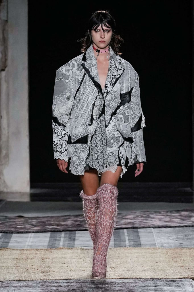 A stupire però sono le lavorazioni in patchwork realizzate su diversi bomber e completi. Come ad esempio il blazer fatto interamente in patchwork di pelle e pizzo. O completi sempre in patchwork di tartan, onnipresente in tutte le collezioni del brand. Insomma un racconto portato in scena, che ha rispecchiato l’identità di Rave Review e la sua anima a tratti punk e a tratti rock. Sicuramente una collezione audace e coraggiosa, che è fatta per non piacere a tutti!