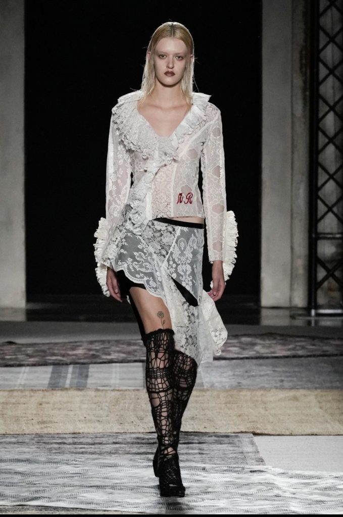 Una collezione che si divide in due parti: e mentre la prima può ingannare l’occhio dello spettatore, la seconda invece rispecchia appieno il concept della collezione. Aprono la sfilata abiti, completi e gonne bianchi in pizzo, in perfetta simbiosi con la location. Inizialmente si fanno protagonisti della sfilata colori chiari, pastello, come rosa bianco e giallo. Ancora trasparenze, mini abiti che ricordano delle sottovesti e stampe floreali che invadono la scena.