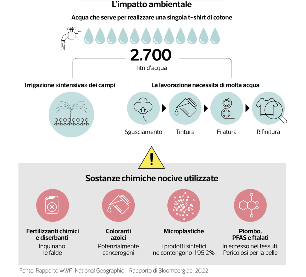 E non suona strano sentire che processi di produzione intensivi, come quelli del fast-fashion appunto, richiedano l’utilizzo di fertilizzanti chimici e diserbanti altamente tossici. Stesso discorso vale per i coloranti azoici, poco costosi, e utilizzati per la resa brillante del colore.