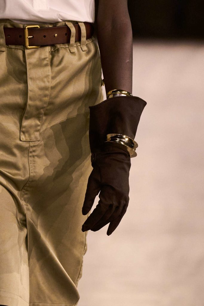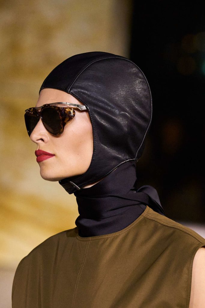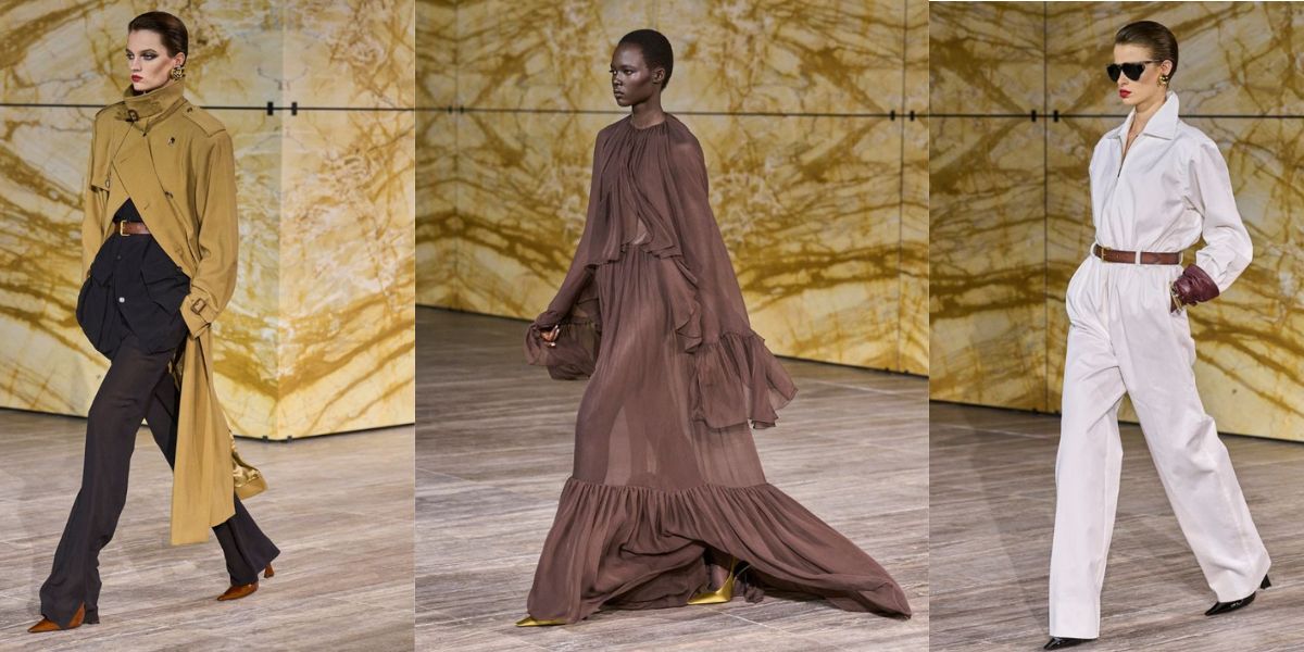 Anthony Vaccarello celebra le donne aviatrice, sulle note di Catherine Deneuve, con sahariane, tute leggere e chemisier, ricordando le origini della maison ai tempi del fondatore Saint Laurent (la sagoma della giacca safari era stata introdotta per la prima volta allo show del 1967 da Saint Laurent)