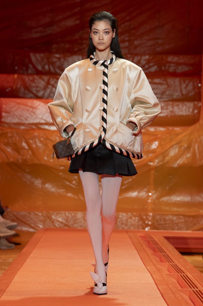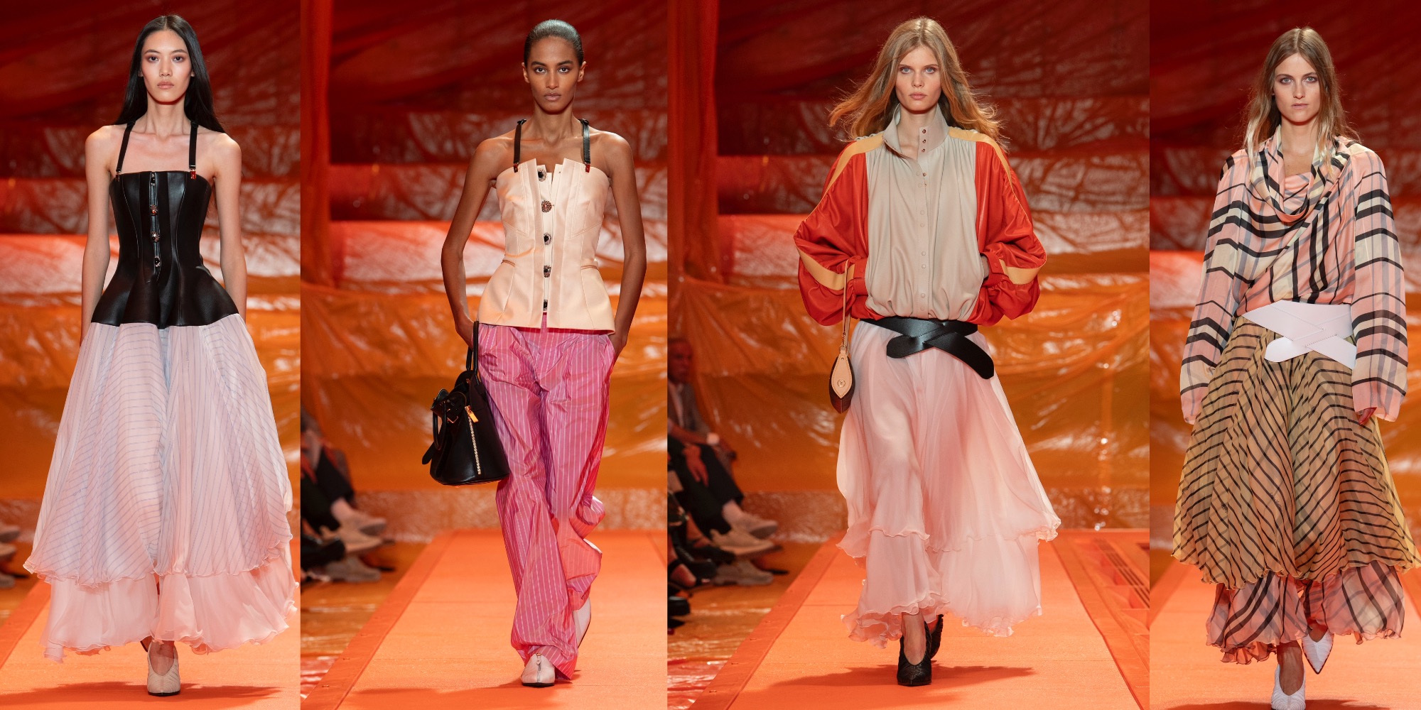 Il défilé si è aperto sulle note synth pop dell’artista francese Zaho de Sagazan. Gonne a balze svolazzanti e giacche da baseball oversize abbinate a cinture a vita bassa – le protagoniste della sfilata. Dopo le prime uscite più comfort, sono apparsi pantaloni di pelle con bustini attillati in vita e svasati sui fianchi, impermeabili lunghi, blazer dalla linea maschile. Ma anche bluse morbide e minigonne con collant bianchi, presenti in molti outfit di questa SS. Stile vintage, minimalismo anni ’80 e abbondanti righe facevano da padroni. Il tema del viaggio in mongolfiera è stato ritrovato negli orli a palloncino delle giacche, nelle maniche a paracadute di giacche e camicette e nei cappelli. Il tutto abbinato a décolleté tacco alto di pelle intrecciata che avevano tutta l’aria di essere un fazzoletto annodato.