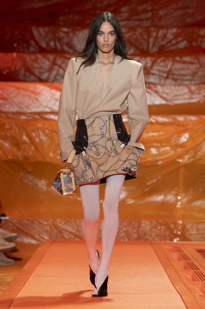 Tra stampe contrastanti e singolari fantasie abbinate l’una all’altra, Nicolas Ghesquière ha portato il suo pubblico lontano dalla torpida aria di questa Fashion Week. Ambientata nel cantiere aperto di uno storico edificio anni Venti in stile Art Nouveau sugli Champs-Elysées, a fianco del nuovo quartier generale del marchio, lo show è stato allestito dallo scenografo americano James Chinlund. Particolari erano i lampadari globulari. Veri e propri elementi dell’espressione del design degli ultimi anni. Pendevano dal soffitto e decoravano la grande sala rivestita in plastica color mandarino abbinata alla passerella arancione. Sembrava di essere all’interno di una gigantesca mongolfiera!