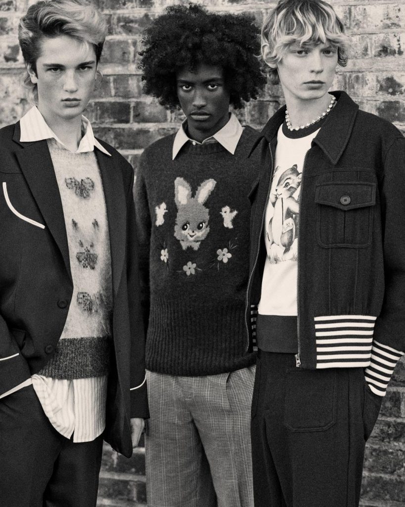 La maglieria è una componente importante della collezione. Lambert ha introdotto pezzi intarsiati con personaggi divertenti che personificano l’indole di Cutie Chaos. La collezione comprende un maglione arcobaleno, così come gilet eleganti da sovrapporre alle camicie dal colletto importante che sono disponibili in tonalità inaspettate. La collezione presenta anche una ricca selezione di capispalla: le giacche eleganti con zip e colletto sono una scossa di nostalgia. Mentre altri pezzi, a partire dalla classica silhouette maschile, sono oversize in proporzioni esagerate.