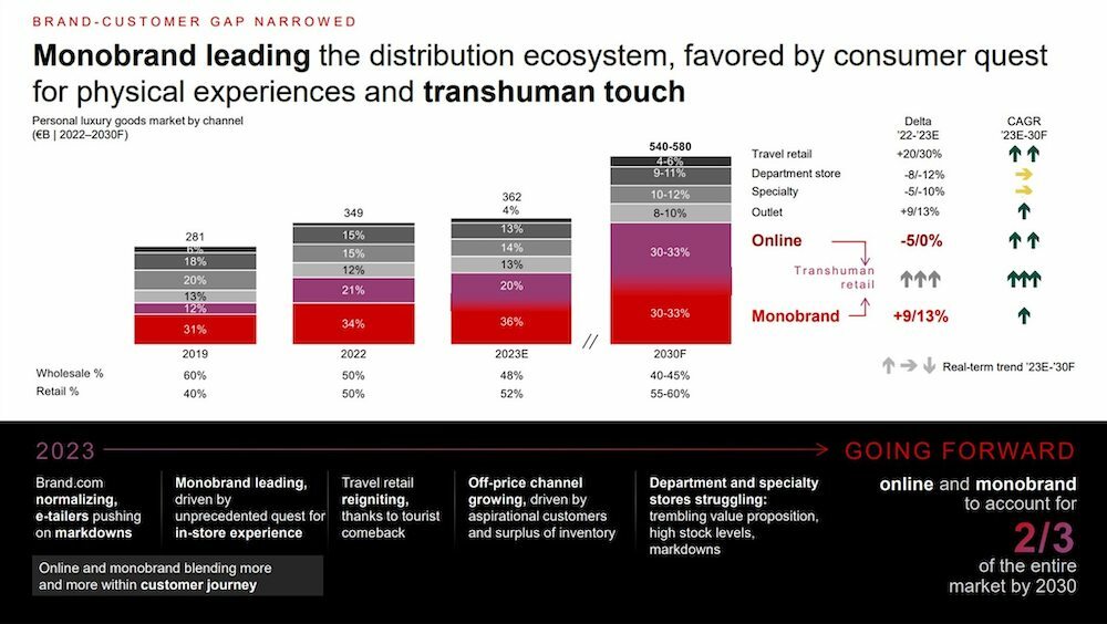 “Stiamo assistendo ad una naturale accelerazione del negozio fisico monomarca, spinta dal ritorno alla vita sociale e al turismo, e un declino dei canali digitali, che si stanno normalizzando”, spiega Federica Levato, partner di Bain & Company e tra gli autori di questo rapporto sul mercato del lusso.