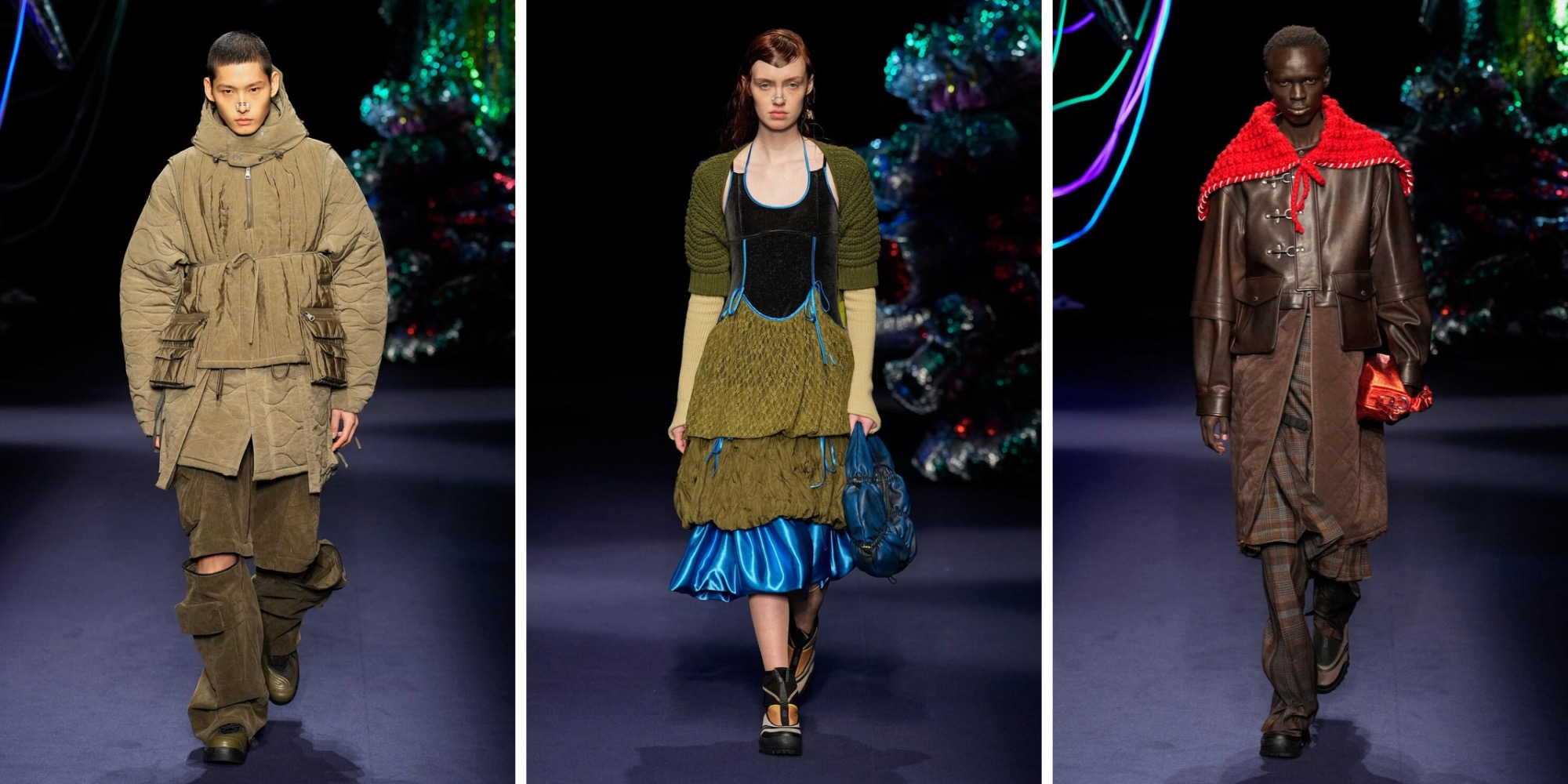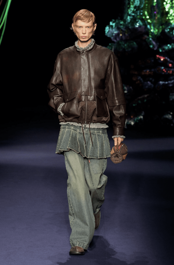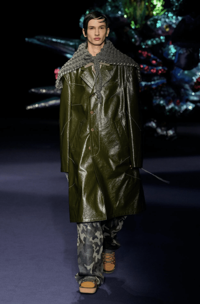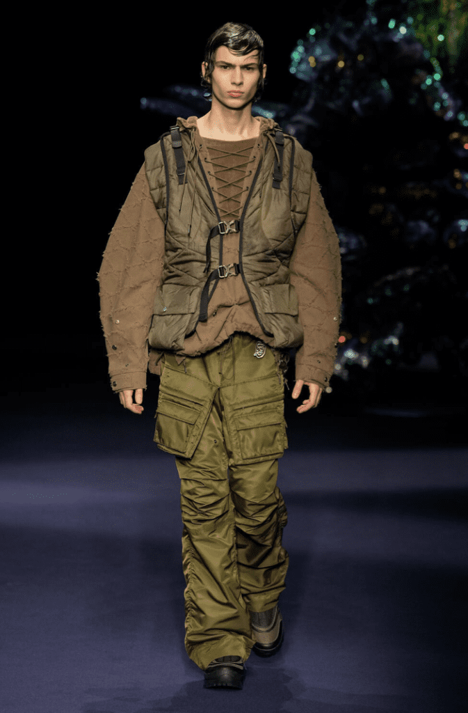 Verdi e marroni sono le tinte che dominano la scena, insieme a baggy pants e capi jeans. Stringhe, lacci, tasconi e cerniere si presentano applicate su montgomery, blazer invecchiati e cappotti che sembrano quasi voler dare un tocco di eleganza.