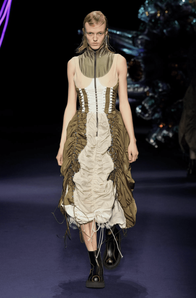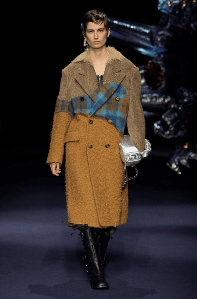 Stratificazioni e patchwork di tessuti a contrasto ci rimandano alla protezione del corpo. Fascette di metallo sul naso quasi a simboleggiare l’allontanamento da qualcosa che ci è estraneo.