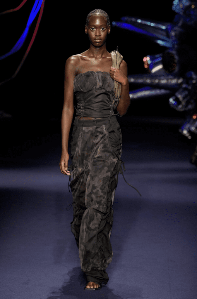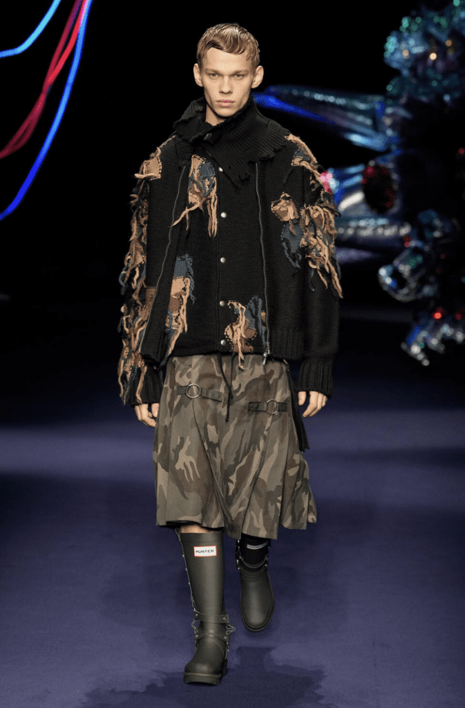 Ci sono anche minigonne abbinate a maxi cargo jeans. Il tutto mischiato a qualche stampa tartan e camouflage di qua e di là. Un po’ di confusione? Oppure era proprio questo l’effetto che DoHun Kim voleva ottenere?