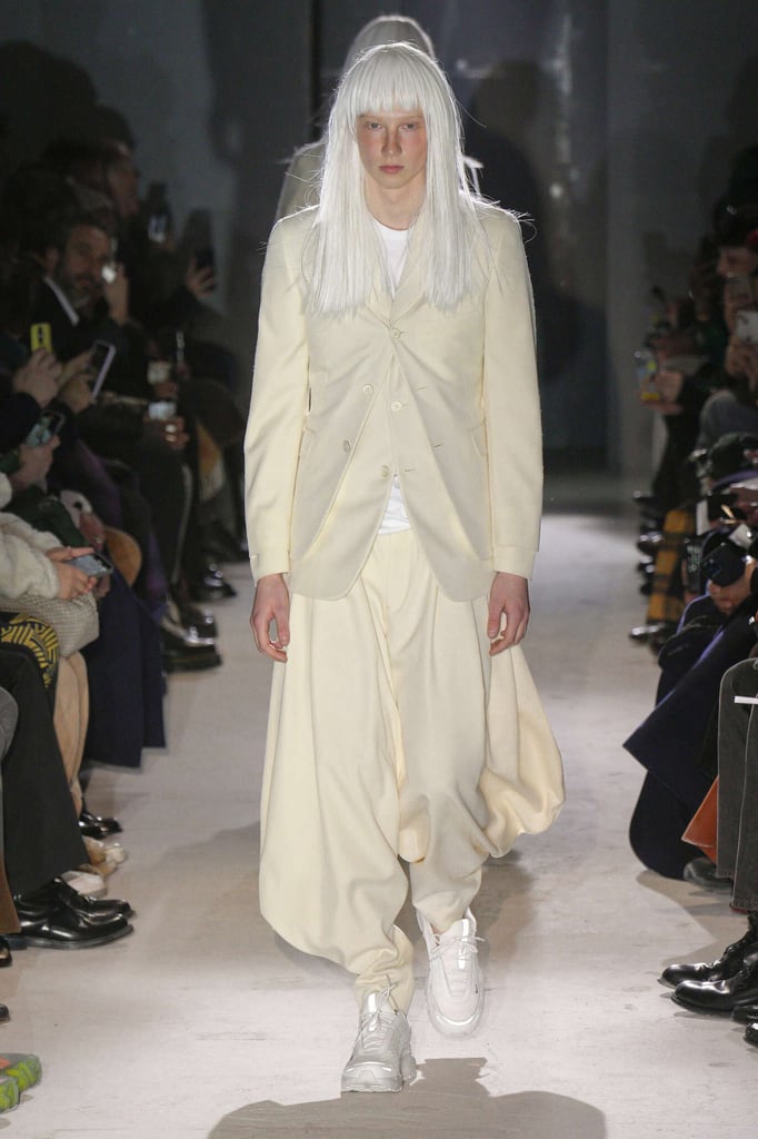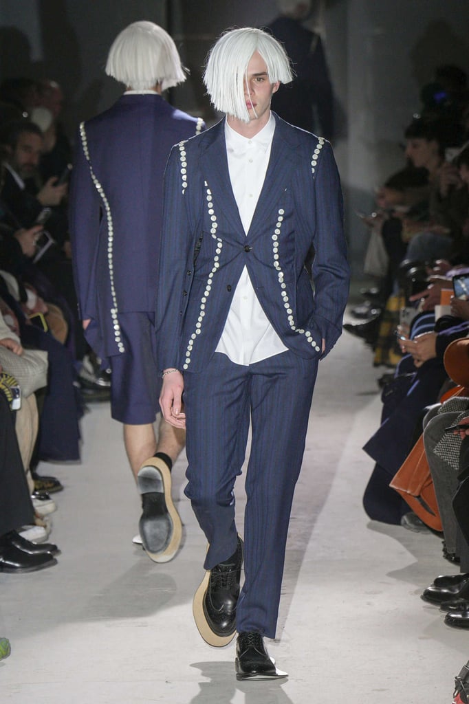 Nel ‘700 l’aristocrazia francese portava le parrucche incipriate come discriminante sociale. Simbolo di regalità ed importanza le parrucche sono state uno degli ultimi vezzi riservati alla moda maschile destinata, poi, a diventare più pratica ed essenziale. Tornano alla ribalta oggi, dopo più di un secolo, sulla passerella di Comme Des Garcones dove ogni modello è armato di una parrucca bianca che rimanda, per concetto e non per forma, a quella Parigi della corte di Versailles. In una declinazione decisamente più contemporanea l’accessorio, ormai desueto, diventa il focus point dell’intero show. Di tutte le fogge e lunghezze le parrucche incorniciano il capo dei modelli che sfilano vestendo una moda estremamente minimale e monocromatica.