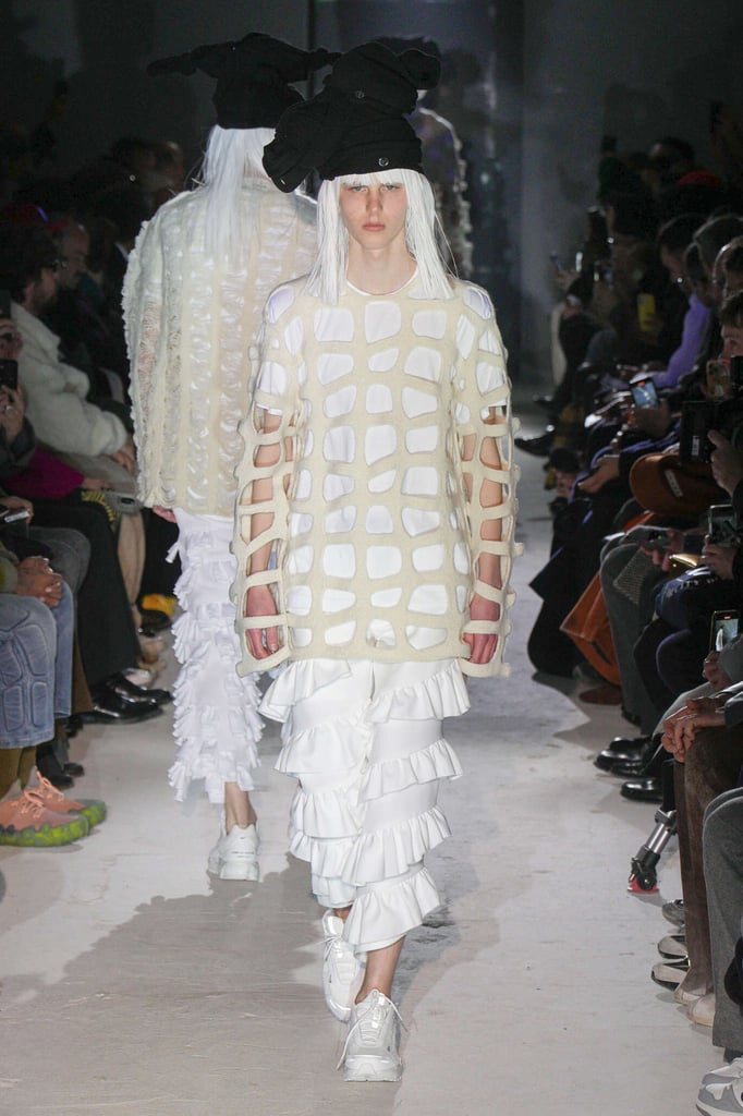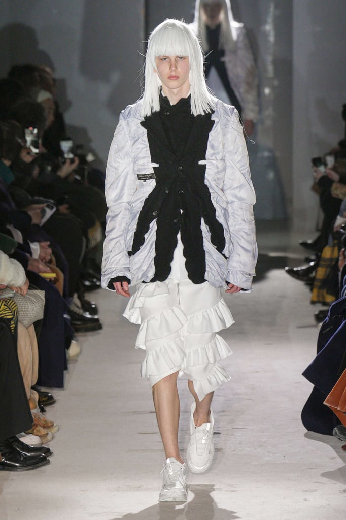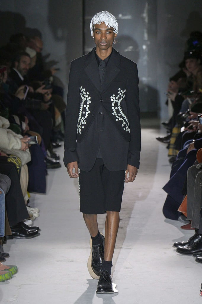 Al confine tra lo stile homeless e un aristocratico del ‘700 la passerella di Comme Des Garcons è alimentata dai contrasti. Convivono, nello stesso show, capi sgualciti, che paiono essere troppo stretti, e leziosi dettagli tipici della moda del ‘700. Pantaloni dal taglio toreador impreziositi da volant che ricordano, per certi versi, le coulotte del XVIII secolo parigino vengono accostati a serissimi capispalla dal taglio singolare, realizzati nei tessuti emblematici della più classica moda maschile. Nessuno spazio al colore, la sfilata è dominata dalla monocromia più assoluta. Le uscite sembrano essere una coreografia diretta ad arte che alterna colori chiari e scuri con un ritmo scandito dai pochi accenni di tonalità di grigio e blu.