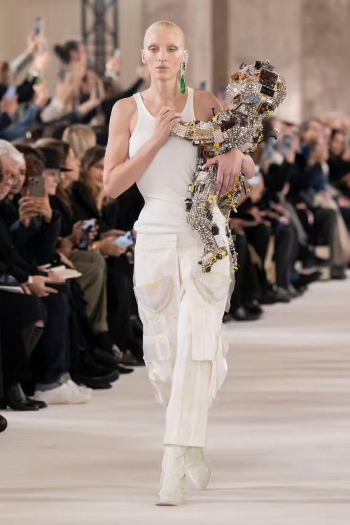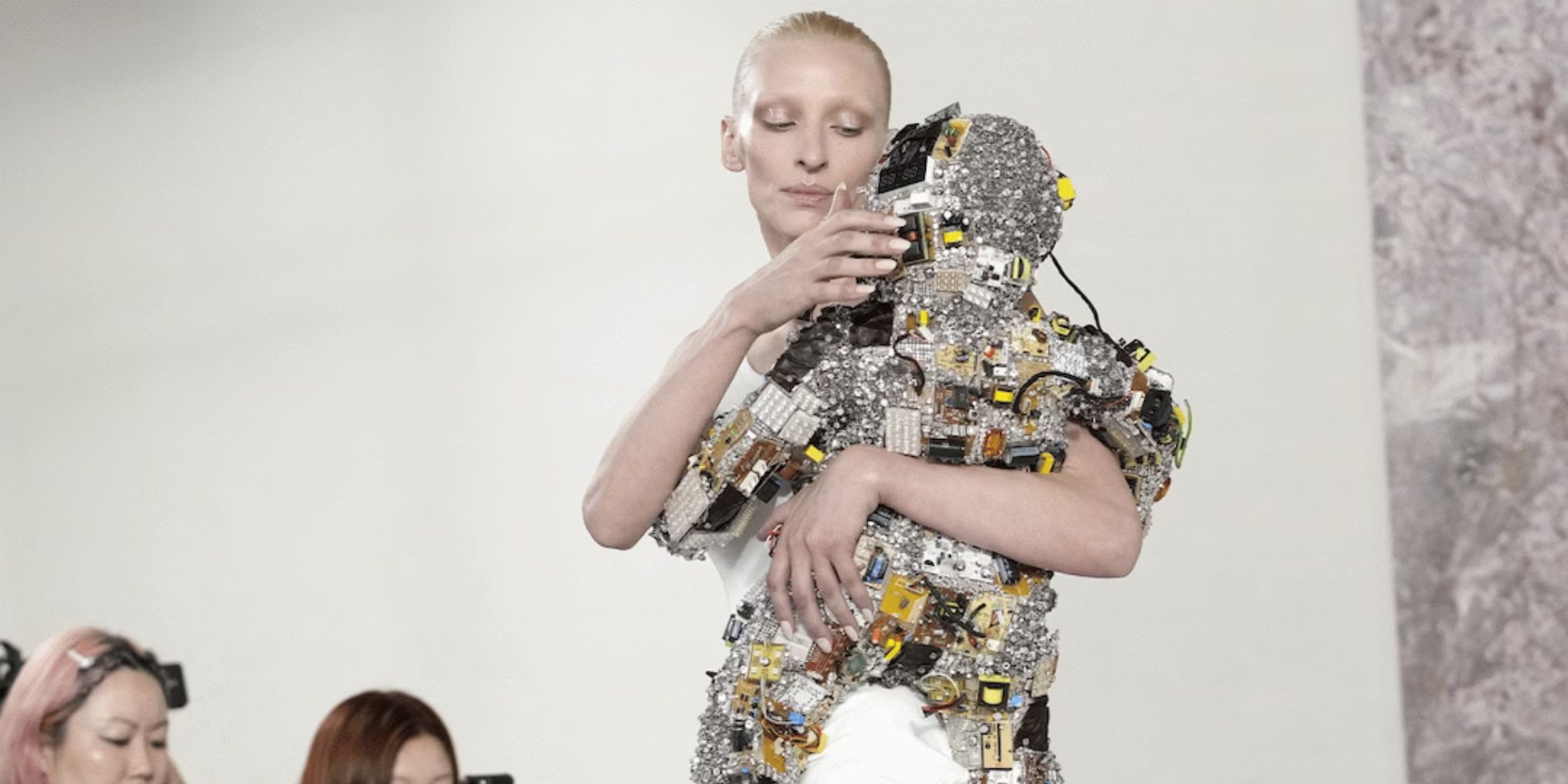 Il corpo, da sempre oggetto di studio di Elsa Schiaparelli, viene reinterpretato attraverso il filtro della tecnologia. Così, al fianco di un riadattamento dell’abito “Scheletro”, realizzato dalla stessa Elsa nel 1938, Daniel Roseberry propone una nuova idea di corpo. Un corpo che si piega alle influenze del mondo tecnologico. Cavi, microchip ed altro orpelli tecnologici sono i nuovi pizzi e merletti che adornano gli abiti costruendo una nuova immagine di donna. Tra gli “accessori” più shocking sfila, tra le mani di Maggie Maurer, un bambino fatto di quei dettagli tech di cui sono adornati gli abiti. Simbolo di un futuro non troppo lontano in cui uomo e robot si fonderanno sempre di più quasi a diventare indistinguibili.