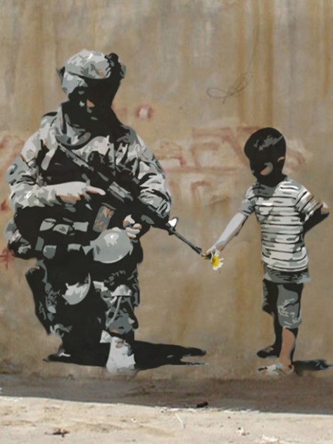 Banksy nel 2007 crea uno stencil su muro a Betlemme: Bambino che infila un fiore nella canna del fucile di un soldato