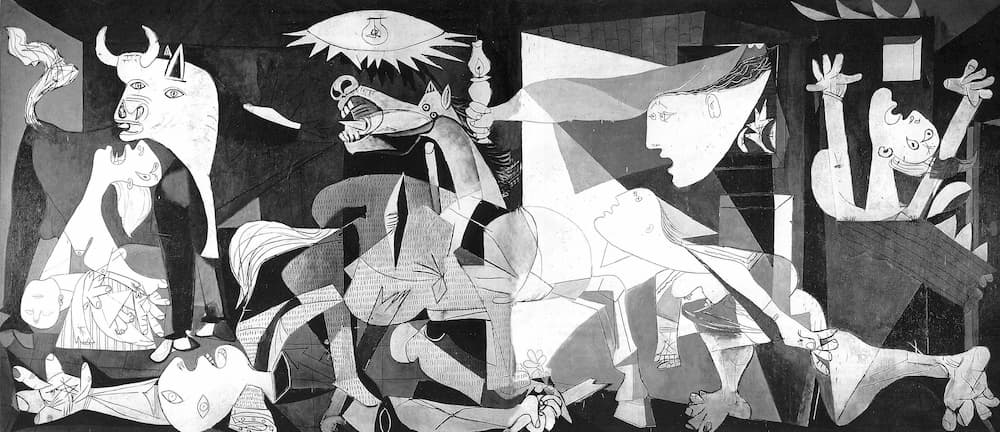 Picasso ci offre una panoramica suggestiva e impattante sui terribili scenari conseguenti al bombardamento subito dalla città di Guernica durante la guerra civile spagnola. L’intento dell’artista era di porre l’attenzione dell’osservatore sul monocromo segno dell’assenza di vita, e imporre il suo stop alle brutalità della guerra.