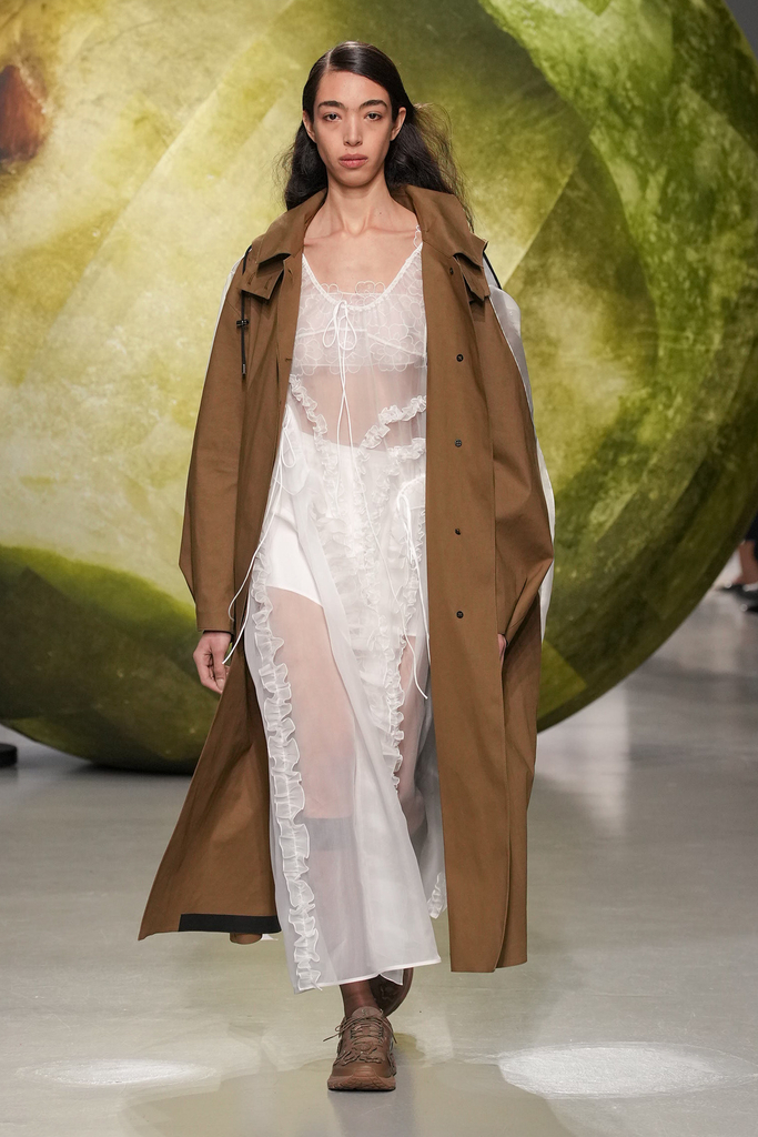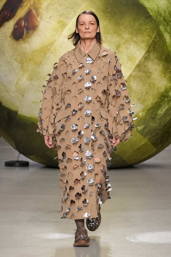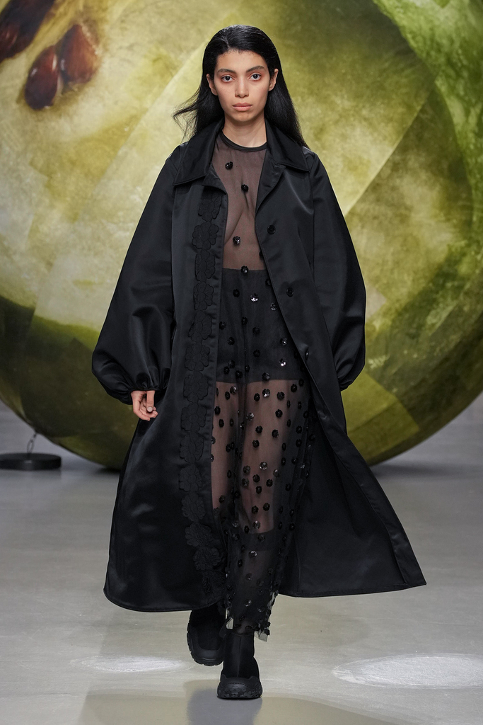 Cacciata dal paradiso terrestre la donna di Cecilie Bahnsen fa i conti con la realtà. E’ pratica, dinamica e pronta ad affrontare le sfide di un mondo molto diverso dall’Eden. Nella collezione colpiscono i contrasti tra i materiali. La pelle duetta con i più impalpabili tessuti dal finish trasparente. Dettagli argento, quasi futuristici, fanno capolino su eleganti beige o viceversa. In passerella un trench coat beige è impreziosito da elementi floreali blin blin argento.