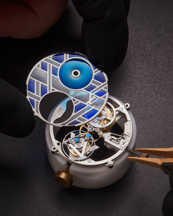 Nel cuore del nuovo modello di orologio, Louis Vuitton, con questa tecnica delicatissima, poggia un capolavoro smaltato sviluppato dagli artigiani bizantini durante il quarto e quinto secolo.