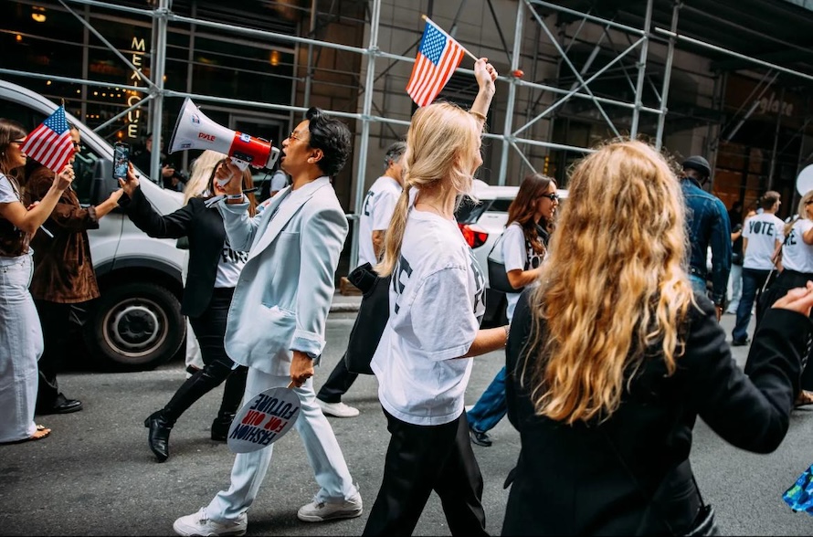 Come di consueto è la Grande Mela a dare il la al mese dedicato alla moda. Il primo giorno di New York fashion week è un’aternarsi di nomi storici e nuove leve del fashion system. D’altronde New York è la terra delle opportunità, dove tutto può cambiare. La favola del sogno americano che, negli ultimi tempi, non gode di ottima salute. In una città in fermento per le elezioni politiche anche la moda scende in campo. Ad aprire la settimana della moda, infatti, non è una sfilata come ce la aspetteremmo bensì un corteo. La moda scende in piazza con “Fashion for our future“. Una parata organizzata da Vogue insieme al CFDA (Council of Fashion Designers of America) per incoraggiare i cittadini americani a recarsi alle urne.