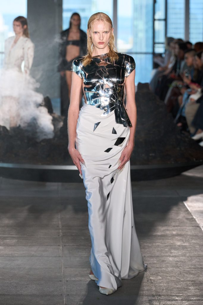 E se si parla di impegno politico non ci si può dimenticare del supporto alle nuove generazioni. Ad aprire il calendario di sfilate, con grande gioia, è una giovane designer: Grace Ling. La sua moda sostenibile e zero waste propone una donna guerriera in un’atmosfera post apocalittica. Abiti sdruciti, pochi colori, dettagli metallici. La moda di Ling è futuro, un futuro distopico, ma estremamente elegante. Punto vita segnato ed unghie affilate pronte ad affrontare il mondo. È “Neanderthal” il titolo della collezione a metà tra un passato lontanissimo ed un futuro tutto da ricostruire.