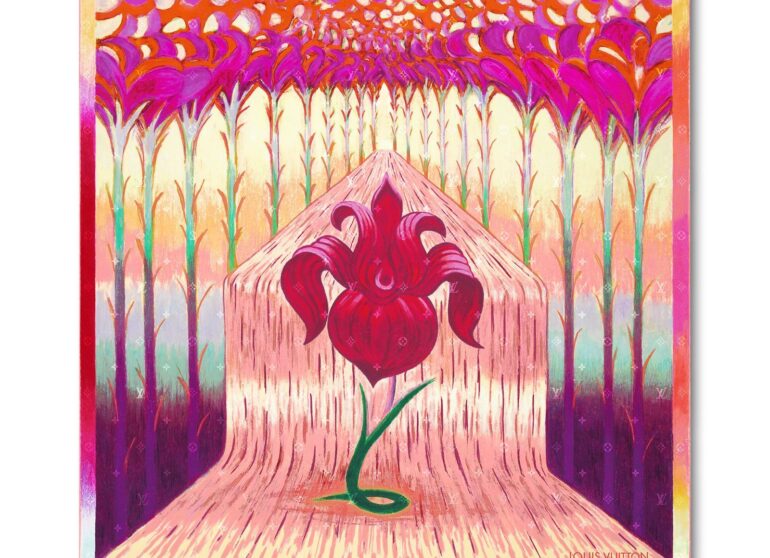 Il suo Carré è un omaggio a un fiore che si trova all’interno di una splendida teca in vetro colorato, in stile Art Nouveau, nella storica dimora della famiglia Vuitton. Incorniciato da alberi multicolore e da una cascata, le forme morbide del fiore diventando il focus di una fantasia caleidoscopica.