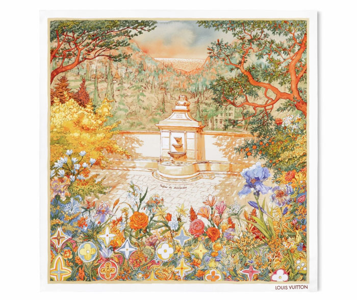 Il novellista e illustratore francese si ispira ai giardini di Grasse, dove nascono le fragranze Louis Vuitton. Il suo Carré mostra un incantevole panorama, realizzato nel suo caratteristico stile stravagante che unisce maestose montagne, intricati fiori e audaci rielaborazioni del motivo Monogram.