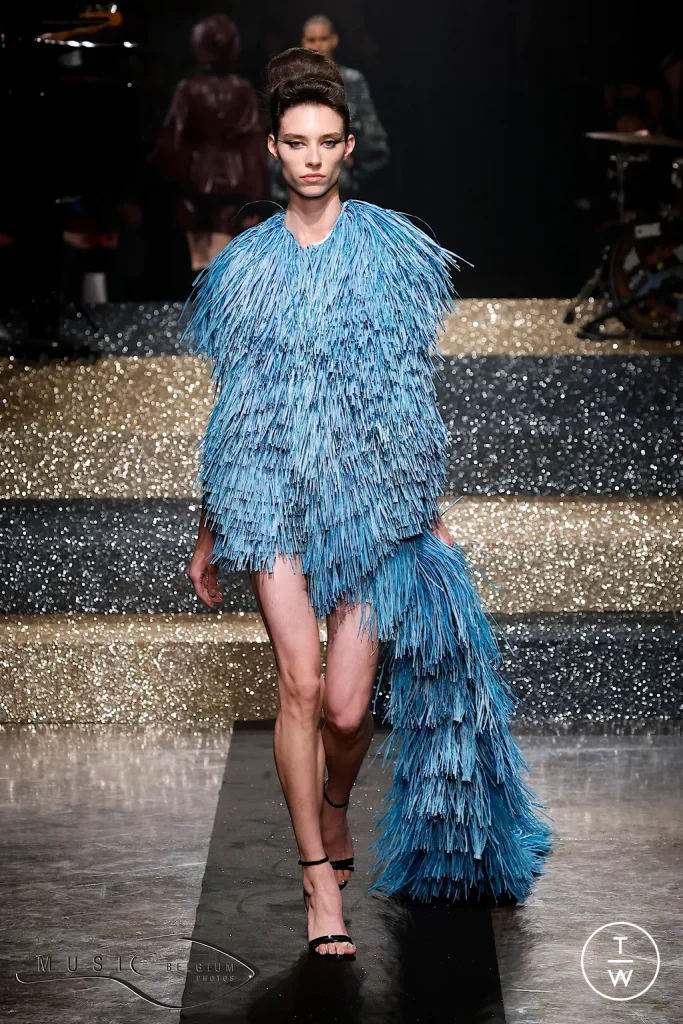 E dallo scuro, passiamo al bianco di Del Core, che per questa sfilata si inventa una storia interessante. Per la collezione SS 2025 Del Core si è immaginato una scienziata studiosa che nonostante sia davvero seriosa, è anche ossessionata dal fashion. La narrativa segue la scienziata in una sua giornata tipo: si passa dall’ambiente sterile del laboratorio, alla sera in cui esce dalla sua crisalide di scienziata per diventare una stravagante creatura della notte. Si passa quindi dal bianco, con trasparenze annesse, a capi strutturati e colorati.