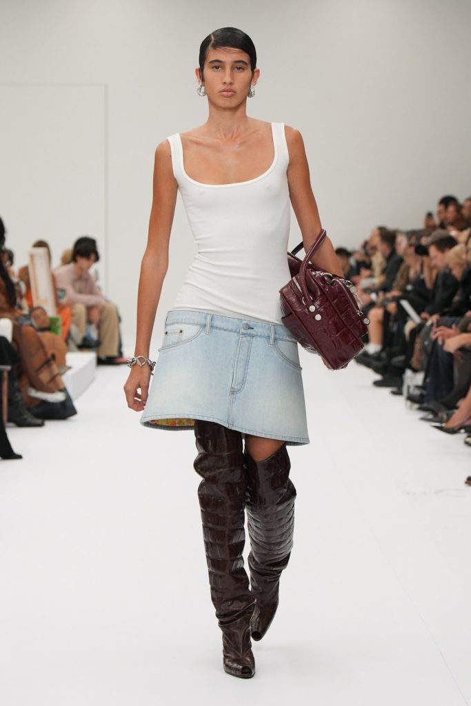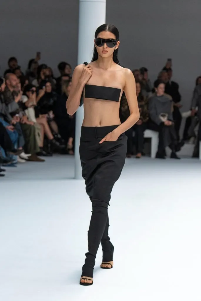 Conosciuto per il suo futurismo dal lontano 1961, anche la SS25 di Courrèges si permea dell’heritage del brand. Geometrie dai tagli netti (ovviamente) e rigore clinico. La severità si fa sexy. Linee dritte rinforzate e posizionate dove non si dovrebbe, o forse proprio dove dovrebbero andare. Serietà, austerità, bianco e nero. Courrèges sa come funziona la matematica e le formule geometriche, per questo delle micro-fasce diventano i top più minimal ( e desiderati) che mai.