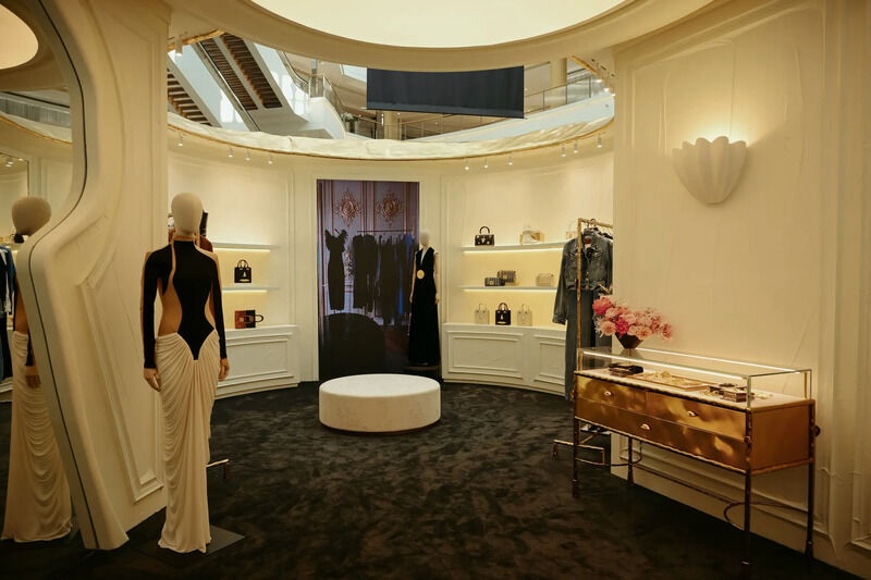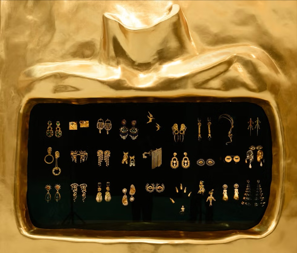 Tutto va a evocare l’ottone dorato martellato utilizzato in tutte le creazioni. A cominciare dalla gigante struttura keyhole. Si annidano piccole nicchie che ospitano accessori, gioielli o pezzi delle recenti collezioni haute couture immaginate da Roseberry. All’interno, il cliente sarà trasportato attraverso i saloni di place Vendôme e le collezioni.