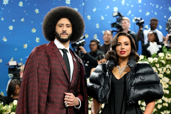 La coppia ha scelto completi sartoriali a righe rosse e blu, con tocchi dandy e riferimenti urban. Alicia abbina il suo tailleur in lana e seta a una sciarpa imbottita oversize, mentre Swizz sfoggia un durag di seta con cristalli Swarovski firmato da Paul Richards.