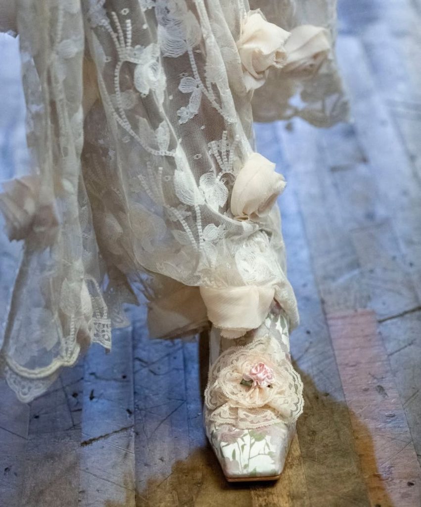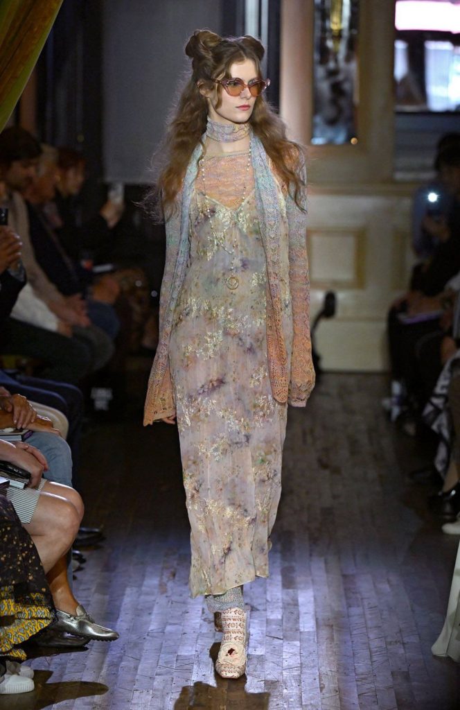 Il mood della sfilata è permeato da un senso di nostalgia dolce, che si riflette nei tessuti leggeri e nelle silhouette fluide. La femminilità di Anna Sui si veste di dettagli poetici, creando un’atmosfera quasi intima, capace di trasportare chi guarda in un racconto fatto di emozioni autentiche e ricordi personali. Il vintage regna sovrano in questa collezione: stili anni ’60 e ’70, movimenti punk, boho e rock‑and‑roll tornano protagonisti, celebrando un’epoca di libertà e spirito creativo. I tessuti sono un tripudio di pattern: fiori, fantasie elaborate, mix melange, pizzi, ricami e texture variegate. Anna Sui unisce con maestria tradizione e innovazione, sperimentando sia con tecniche artigianali come il lavoro a mano e i ricami, sia con tecnologie moderne come la stampa digitale e i tagli laser. La palette cromatica è intensa e romantica, spaziando dal viola e rosa al rosso, con toni terra, blu polverosi e morbide sfumature, arricchita da tocchi di colore pop e dettagli più drammatici. Un’influenza teatrale e gotica si insinua tra i tessuti, dove la femminilità si fonde con un mood dark e anticonvenzionale.