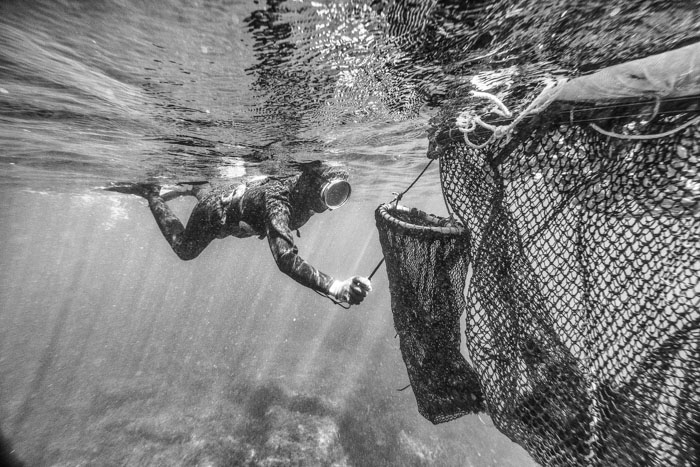 L’attrezzatura si compone poi di alcuni pesi pettorali per facilitare l’immersione, assieme a una zappa da diserbo a forma di L e una rete che si aggancia a un dispositivo di galleggiamento. La parte fondamentale della loro attività è composta però da una preghiera. Dedicata a Jamsugut, la dea del mare, è importantissima per augurare sicurezza e una pesca abbondante.