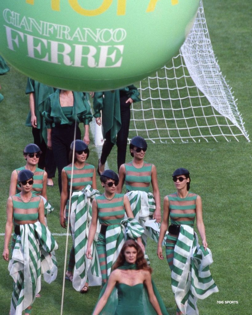 San Siro si è trasformato in un palcoscenico per la moda italiana. Ospitò sfilate firmate da grandi brand in occasione dei Mondiali di Italia degli anni ’90. Ad ognuno di questi venne affidato un colore per ogni continente presente: a Missoni il nero per l’Africa, a Valentino con il rosso per le Americhe, a Schon il giallo per l’Asia e a Ferré il verde per l’Europa. In un’epoca in cui Milano consolidava il suo ruolo di capitale mondiale della moda, il tempio del calcio diventava un laboratorio estetico dove lo sport incontrava l’eleganza. Le passerelle installate sul campo da gioco, tra luci, tribune e suggestioni architettoniche, aprivano la strada a nuovi dialoghi tra moda, arte e cultura urbana.