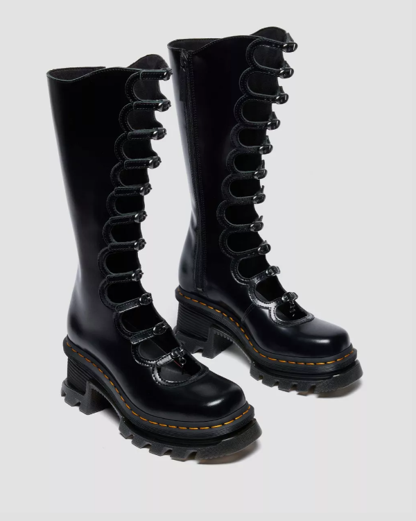 Il Kiki non è mai stato discreto. Metà bambola, metà dominatrice, completamente Marc Jacobs. Dr. Martens lo rende reale: robusto, industriale, pronto a camminare tra i club e le strade illuminate al neon. La silhouette rimane fedele all’originale, ma la forza della suola e la brillantezza della pelle lo rendono uno stivale che fissa lo sguardo e comanda l’attenzione.