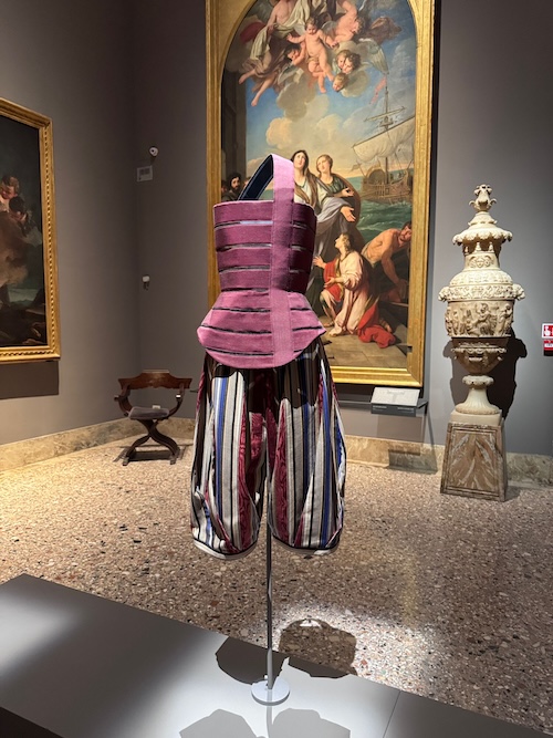 Perhaps the most fascinating section of “Per Amore” is where fashion and paintings mirror each other. The garments echo the hues, textures, and emotions of the artworks they accompany, transforming the exhibition into a fully immersive experience.