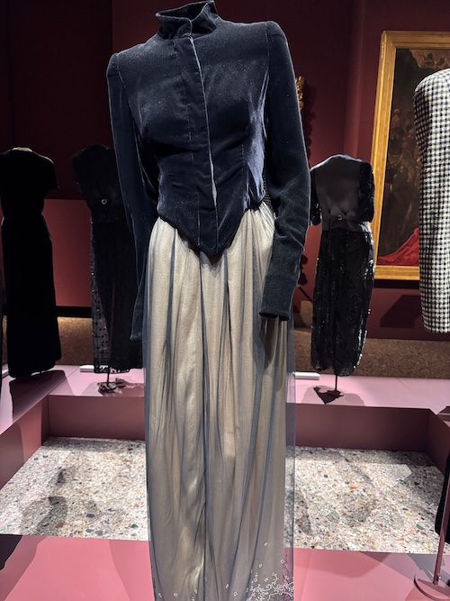 Una delle sale più evocative è quella blu profondo, in cui abiti e completi della stessa sfumatura creano un’atmosfera elegante e contemplativa.