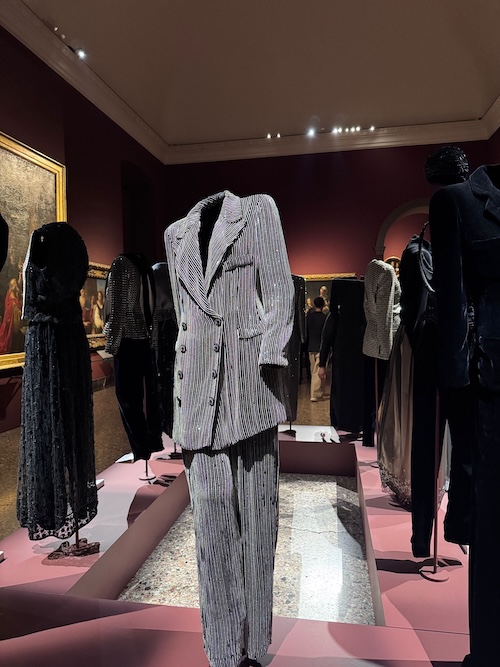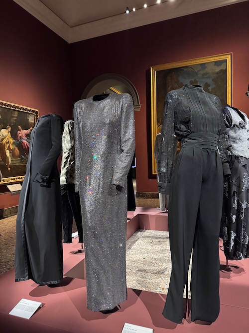 La parte più suggestiva della mostra è quella in cui i capi di Armani rispecchiano le opere d’arte accanto a cui sono esposti. I tessuti, le forme e le tonalità si fondono con i soggetti dei dipinti. Creano un effetto di continuità visiva e di connessione emotiva tra passato e presente.