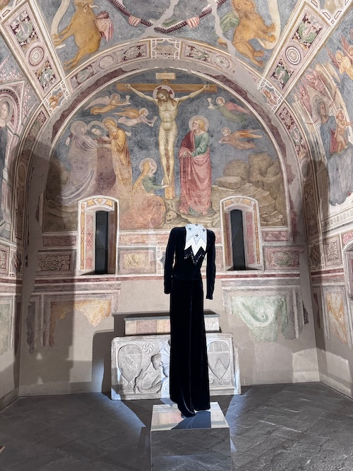 These garments are harmoniously displayed among masterpieces from Brera’s collection, creating a dialogue between couture and classical art, tradition and innovation, style and emotion.