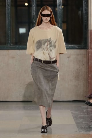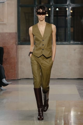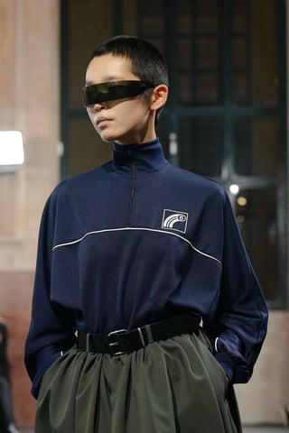 La chiave tecnica è la contaminazione. I capi appaiono come frammenti diversi che si incastrano con naturalezza: giacche sartoriali accanto a felpe asciutte, pantaloni sportivi dialogano con cappotti rigorosi, dettagli equestri si insinuano in silhouette quotidiane. Tutto è sorprendentemente indossabile, come se la sperimentazione fosse già stata assorbita dalla vita reale. Margiela lavora quindi su una tensione sottile: destrutturare senza rompere, estremizzare senza allontanare. Il risultato è una collezione che mantiene la dimensione concettuale tipica della maison ma la traduce in una portabilità concreta, quasi affettuosa.