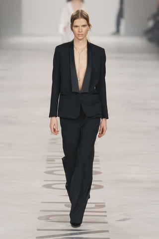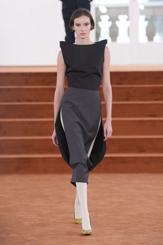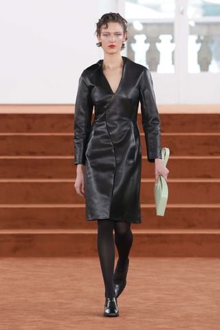 La palette rimane fedele al vocabolario della maison: neri profondi, crema lattiginosi, tocchi di verde minerale e marroni caldi. Ma è la proporzione a fare la differenza. Orli leggermente abbassati, volumi impercettibilmente ampliati, silhouette che sembrano familiari eppure nuove.