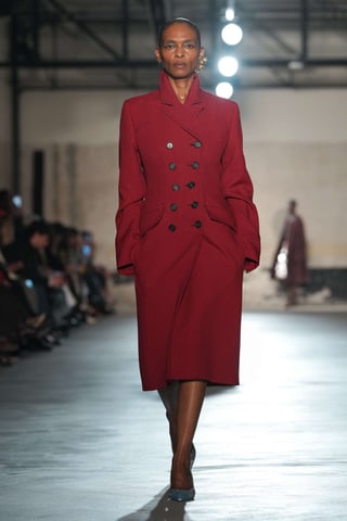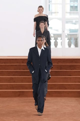 La sfilata di Jil Sander si sviluppa come un esercizio di sottrazione controllata. La costruzione sartoriale è il fulcro: cappotti dalla spalla pulita ma non rigida, giacche con revers allungati e pantaloni a vita alta che accompagnano il movimento senza imporre struttura.