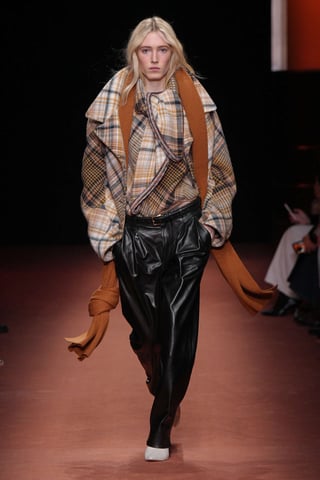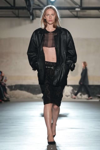 I materiali raccontano la ricerca: lane compatte, flanelle leggere, pelli sottilissime lavorate quasi come tessuti. Il layering è calibrato con precisione architettonica, camicie liquide sotto blazer rigorosi, abiti colonna interrotti da inserti materici, creando una tensione tra morbidezza e disciplina.