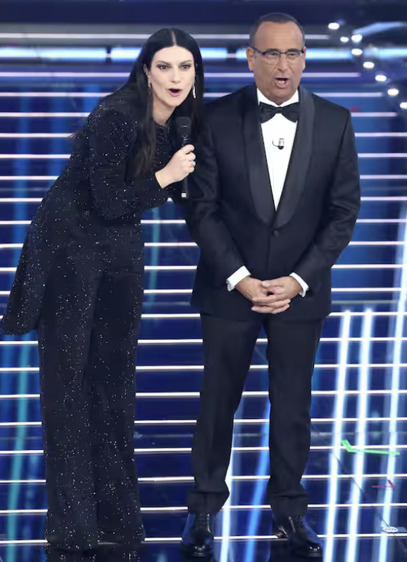 Carlo Conti riappare in smoking monopetto total black di Stefano Ricci, un classico così pulito da risultare blando. Non si può negare che sia elegante, ma qui non si tratta di eleganza: si tratta di presenza. Conti sembra più timoniere di una nave perfetta che capitano di una serata indimenticabile. Ogni parola, ogni cambio di ritmo è regolato con meticolosità chirurgica, tanto che la sensazione di vivere uno spettacolo in tempo reale viene spesso soffocata da quella di assistere a una replica impeccabile. La conduzione rimane precisa, purtroppo senza spina dorsale.