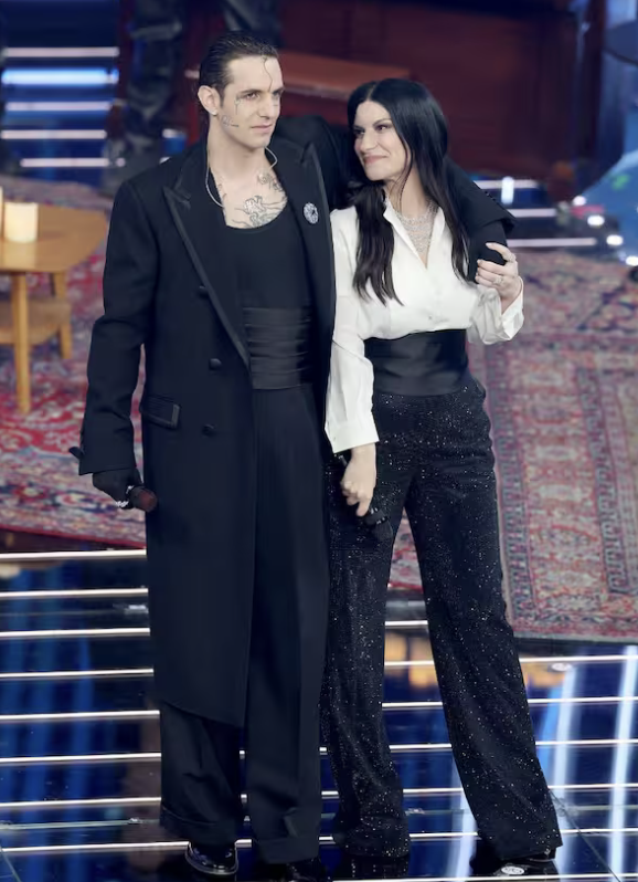 Stesso colore per il duo, un bordeaux studiato che sotto certi riflettori dell’Teatro Ariston quasi si perde, ma l’idea di coordinarsi funziona. Funzionano perché sono diversi ma compatti.