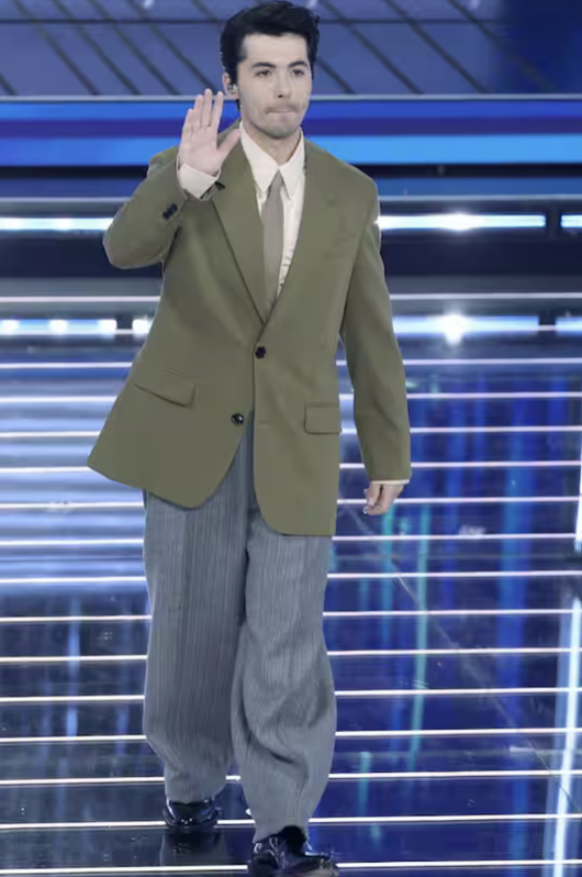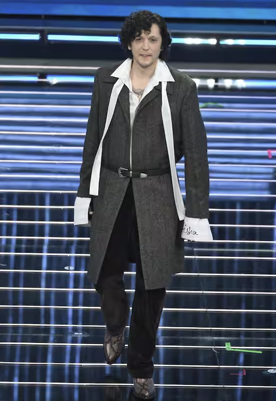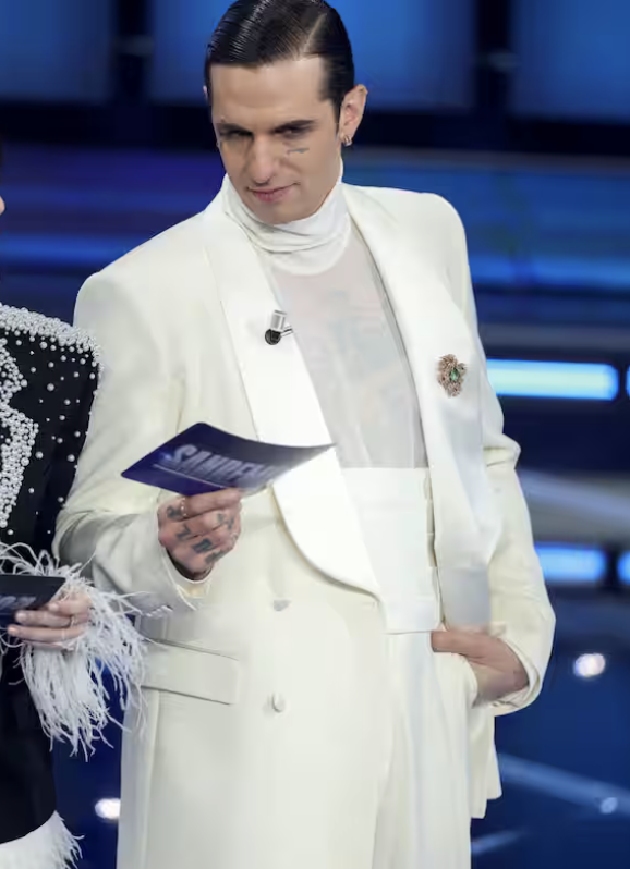 Achille Lauro resta uno dei pochi che sul palco non sembra avere paura. Total white firmato Dolce & Gabbana: blazer strutturato, pantaloni ampi, scollo a V con fiocco basso. Al collo un gioiello importante di Damiani che amplifica la luce e la costruzione del personaggio.
