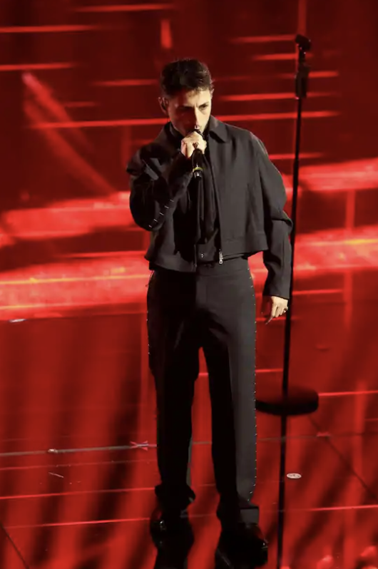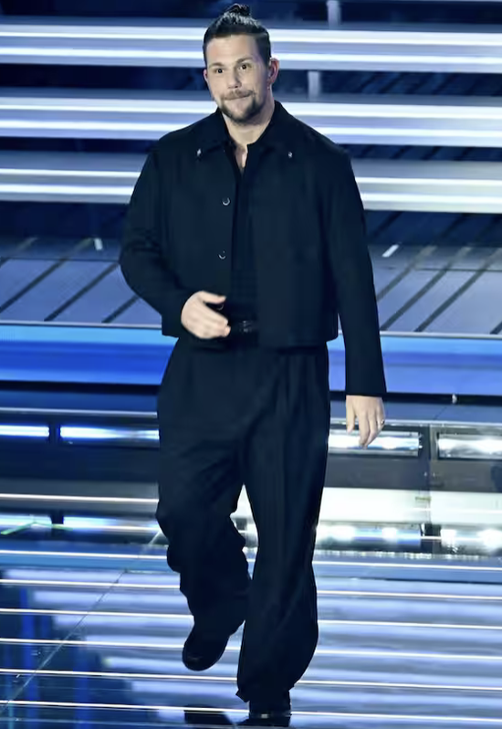 Enrico Nigiotti torna in total black. Ieri camicia, oggi giacca corta e squadrata. Casual chic, coerente con la sua identità. Non gioca a fare altro da sé stesso, e questo è un pregio.