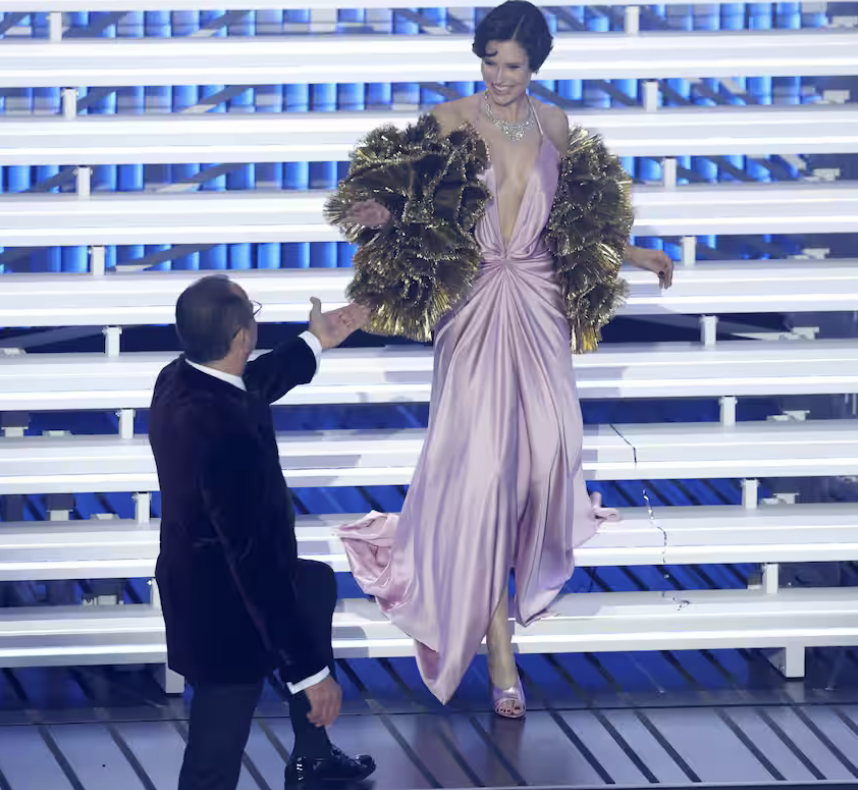 Fa sorridere il fatto che sembri sempre nella stessa posizione, come se fosse incollata al palco e le cambiassero solo l’abito ogni sera. Ma quando canta, il peso della carriera si sente. È emozionante, soprattutto nel momento in cui ricorda l’amica e collega. Legge molto il gobbo, è evidente. Ma l’intenzione è sincera.